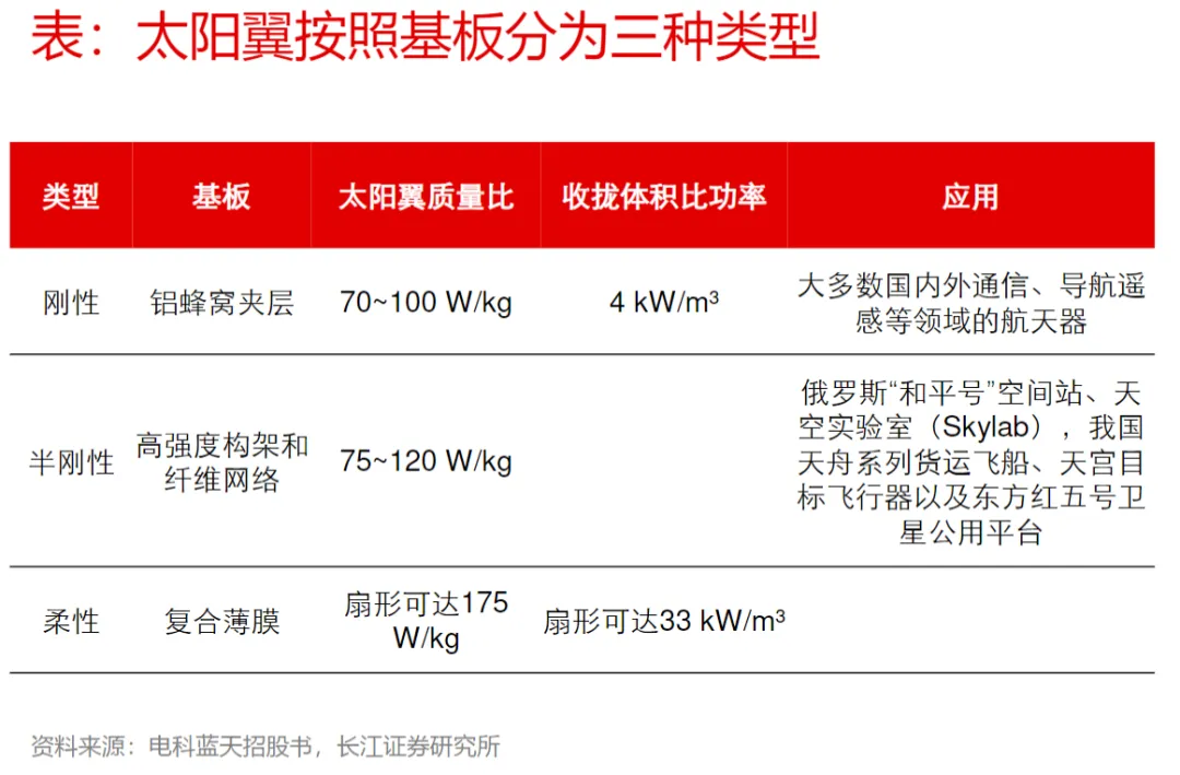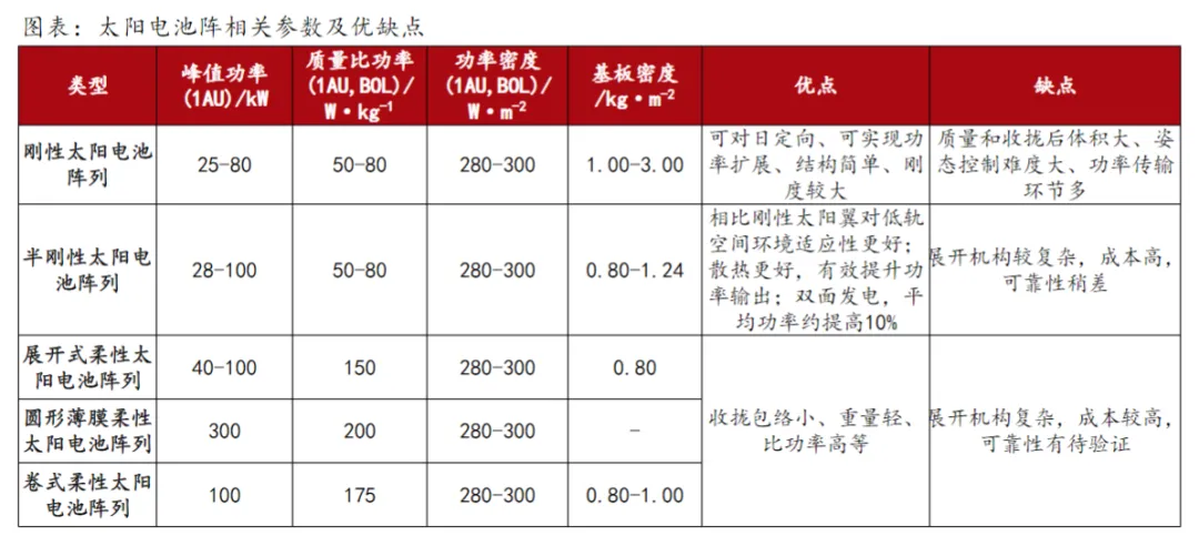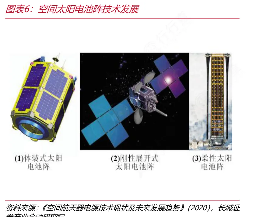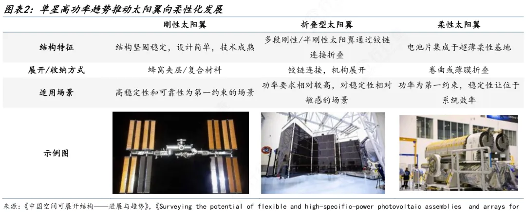 太阳翼发展迭代,呈现“刚性-半刚性-柔性”的清晰路径,伴随电池技术的持续升级,朝着“高效化、轻量化、高收纳比、低成本”方向演进。