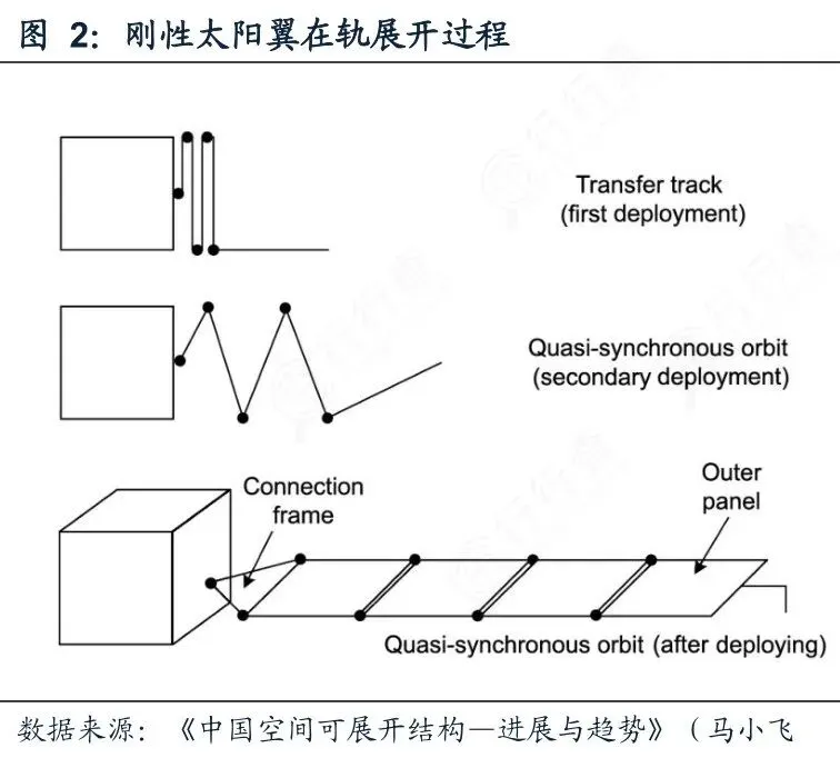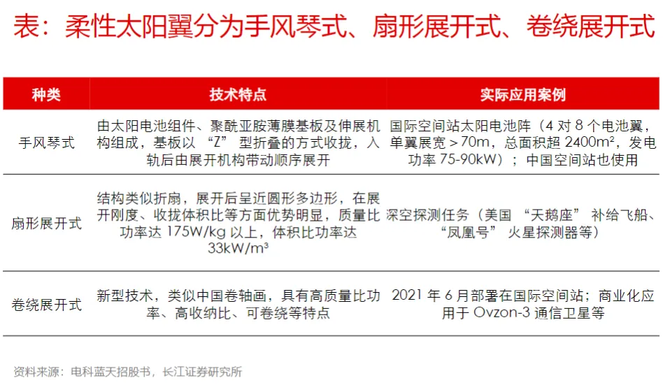 柔性太阳翼采用柔性基板与可折叠结构,重量轻、收纳比极高,可实现大规模折叠与展开,综合优势显著,适配低轨星座等规模化部署场景。从结构来看,柔性太阳翼可分为手风琴式、扇形展开式、卷绕展开式三种。