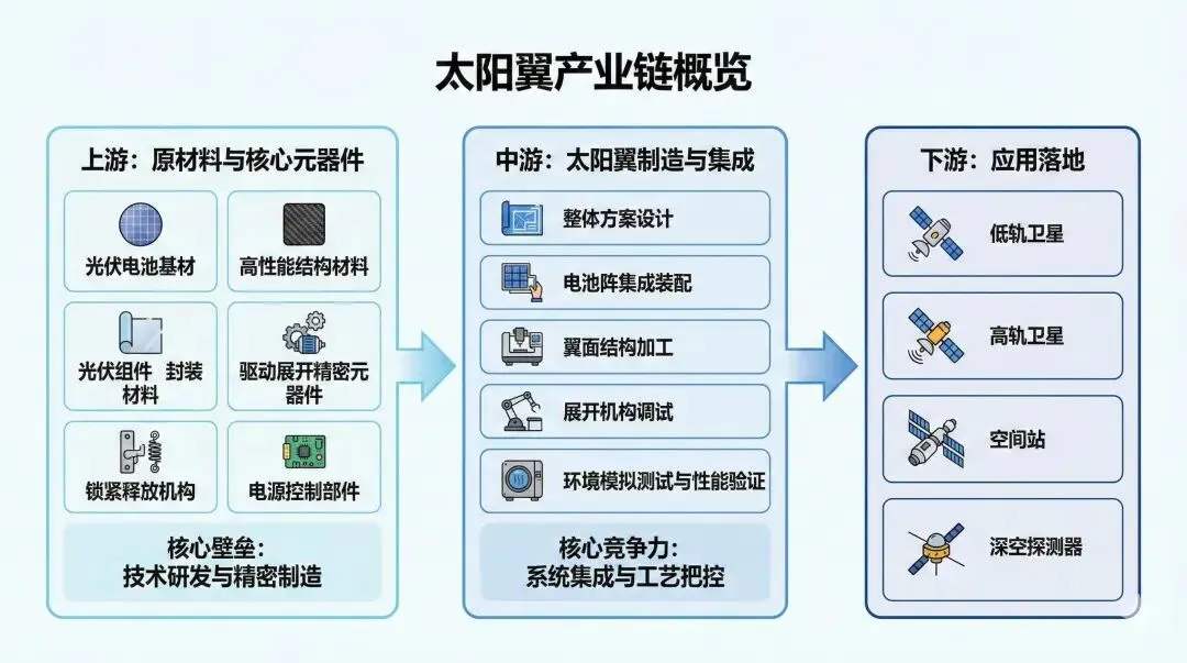 太阳翼产业链的上游为核心材料环节,提供太阳翼制造所需的各类高端材料;中游为核心制造环节,负责将上游材料加工制造成太阳翼成品;下游为应用场景环节,决定了太阳翼的市场规模与发展方向;配套服务环节贯穿全产业链,提供研发测试、在轨维护、认证等相关服务,保障产业链顺畅运行。