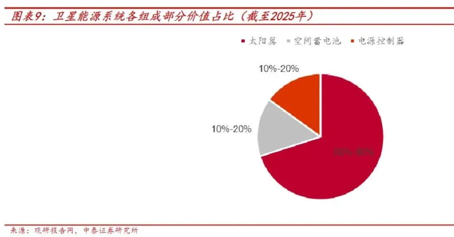 整体来看,太阳翼占卫星价值总量的约12%-24%。另外,卫星能源系统中空间蓄电池价值占比约10%-20%,电源控制器价值占比约10%-20%。