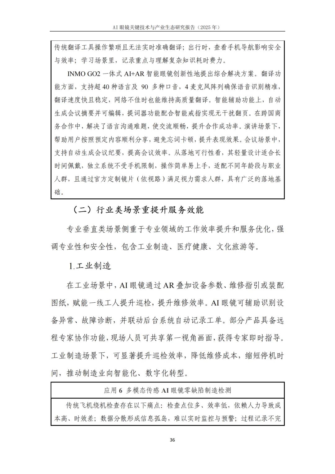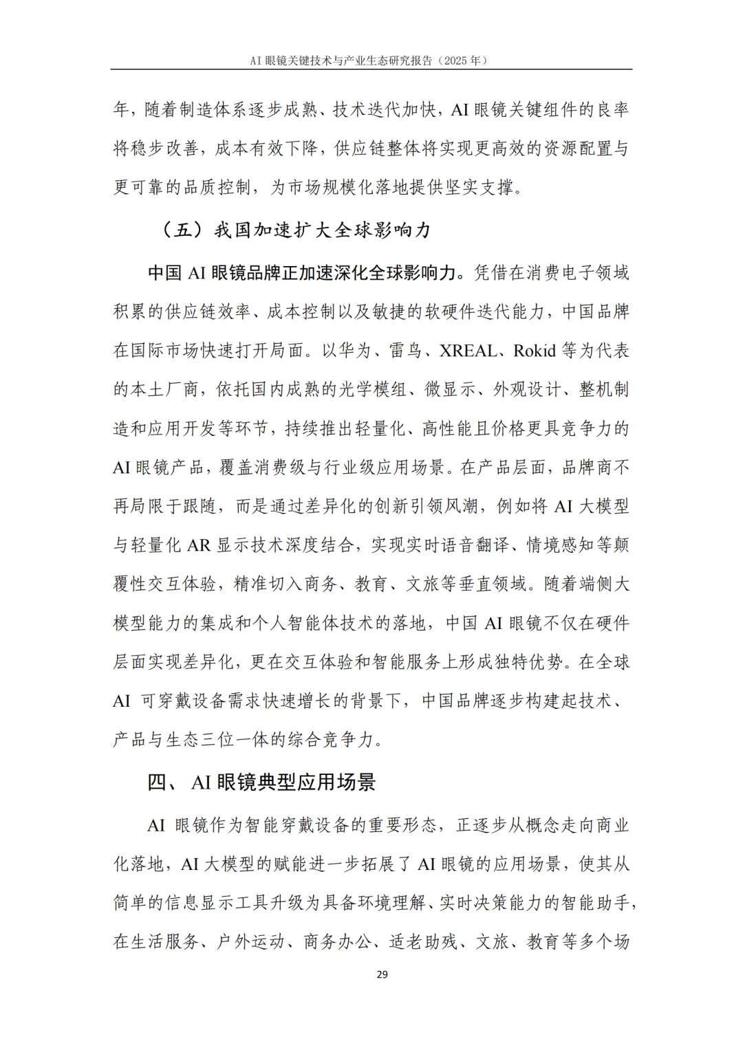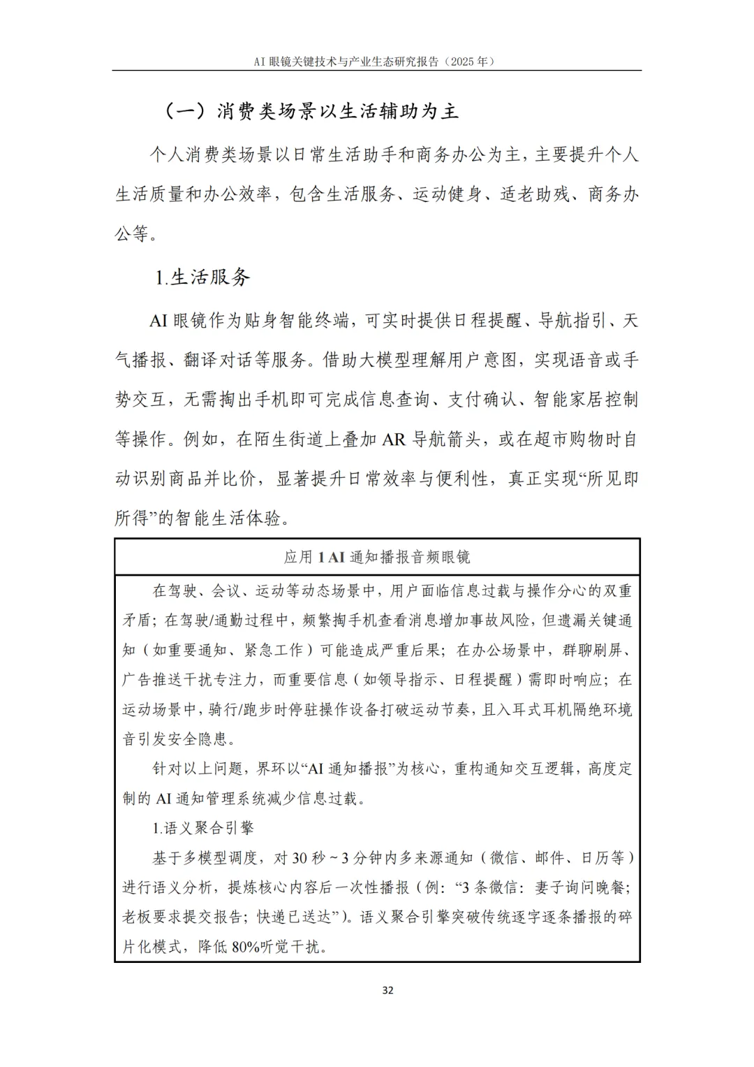 5. 典型应用场景持续丰富拓展:在AI大模型的赋能下,AI眼镜的应用场景不断延伸,从简单信息显示工具升级为具备环境理解与实时决策能力的智能助手。个人消费类场景以生活辅助与商务办公为核心,涵盖生活服务、运动健身、适老助残、商务办公等领域,重点提升个人生活质量与办公效率;专业垂直类场景聚焦工业制造、医疗健康、文化旅游等专业领域,以提升工作效率、优化服务质量为目标,突出专业性与安全性要求。