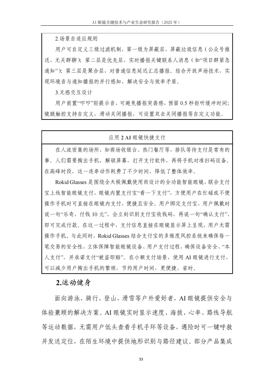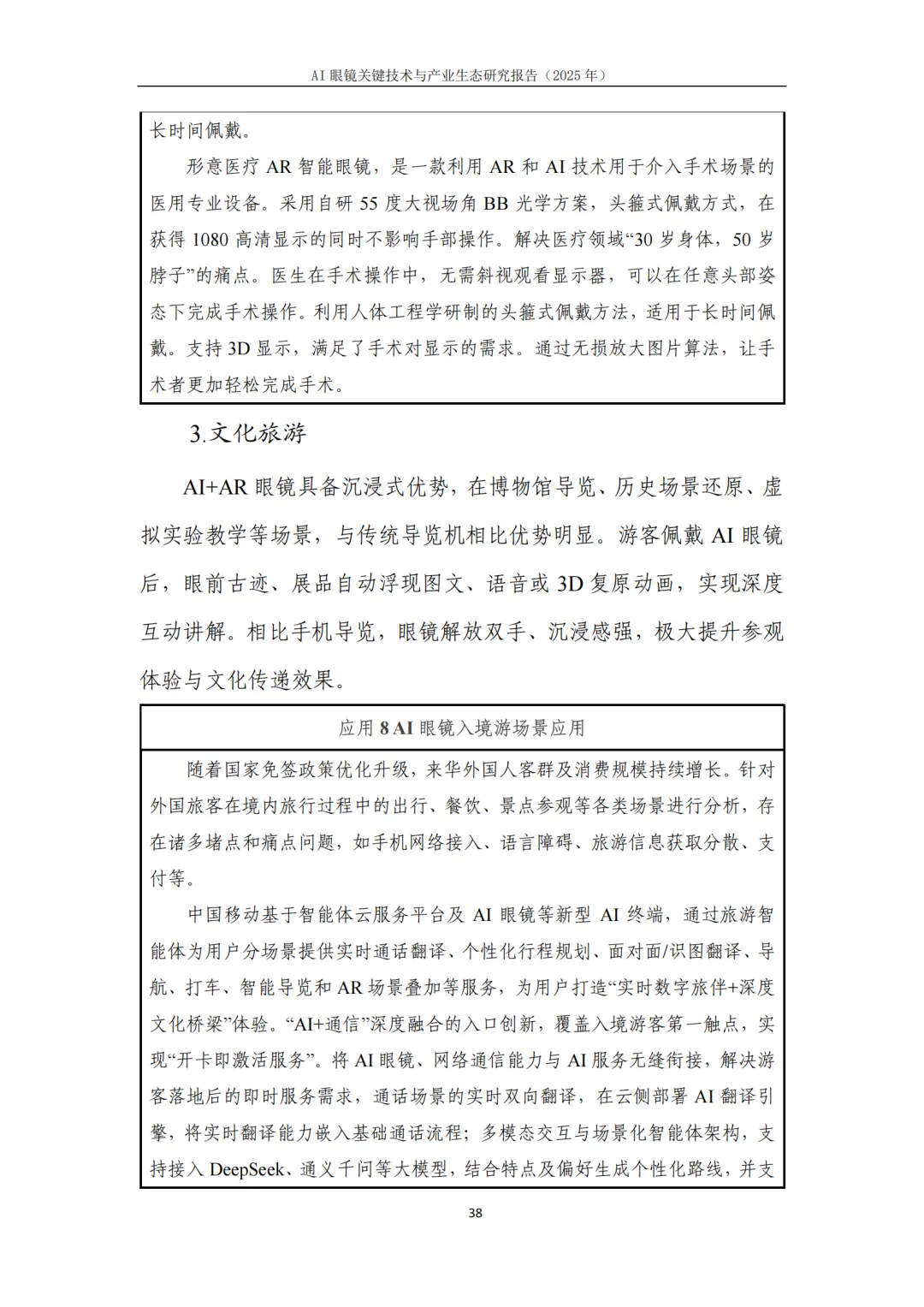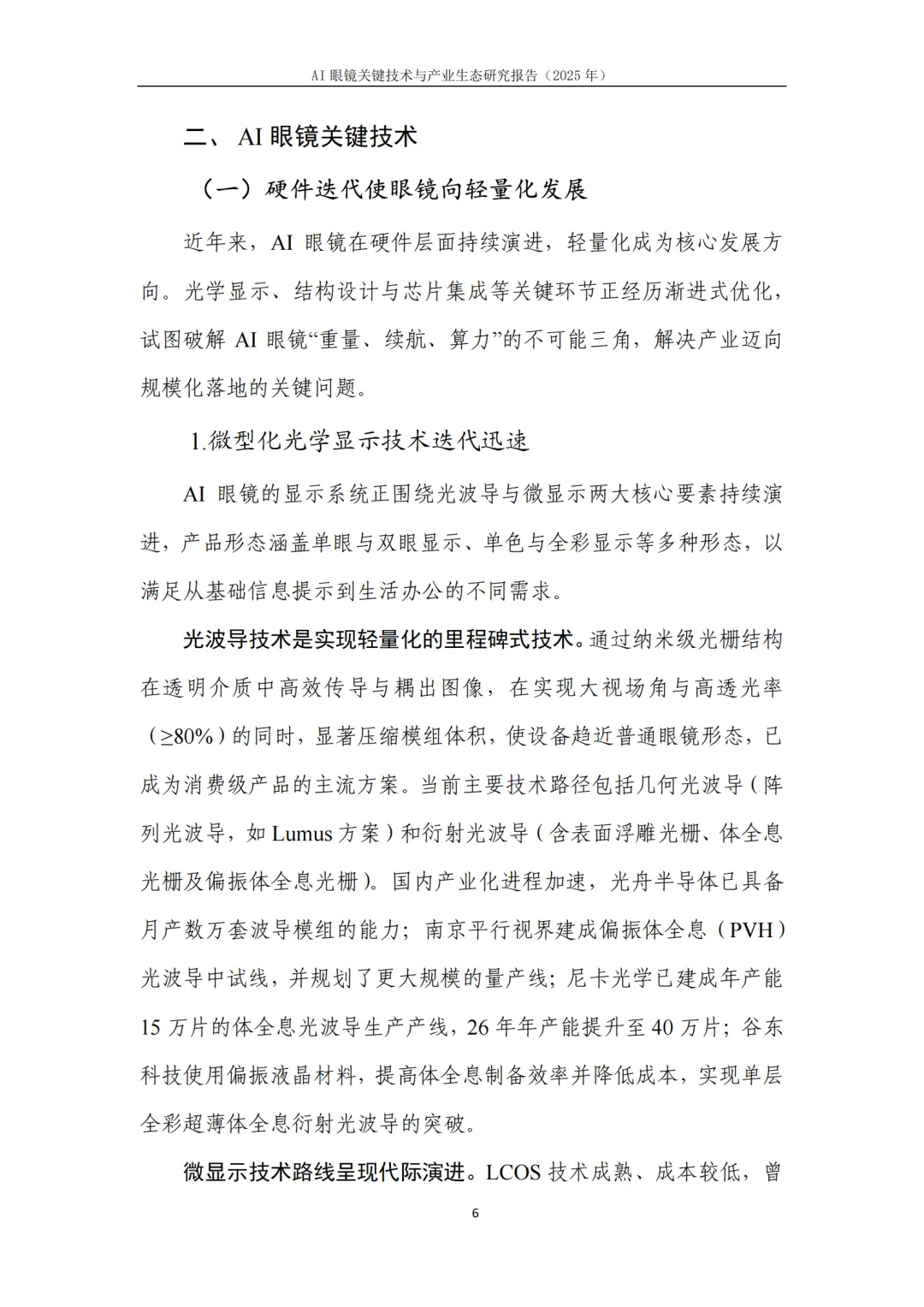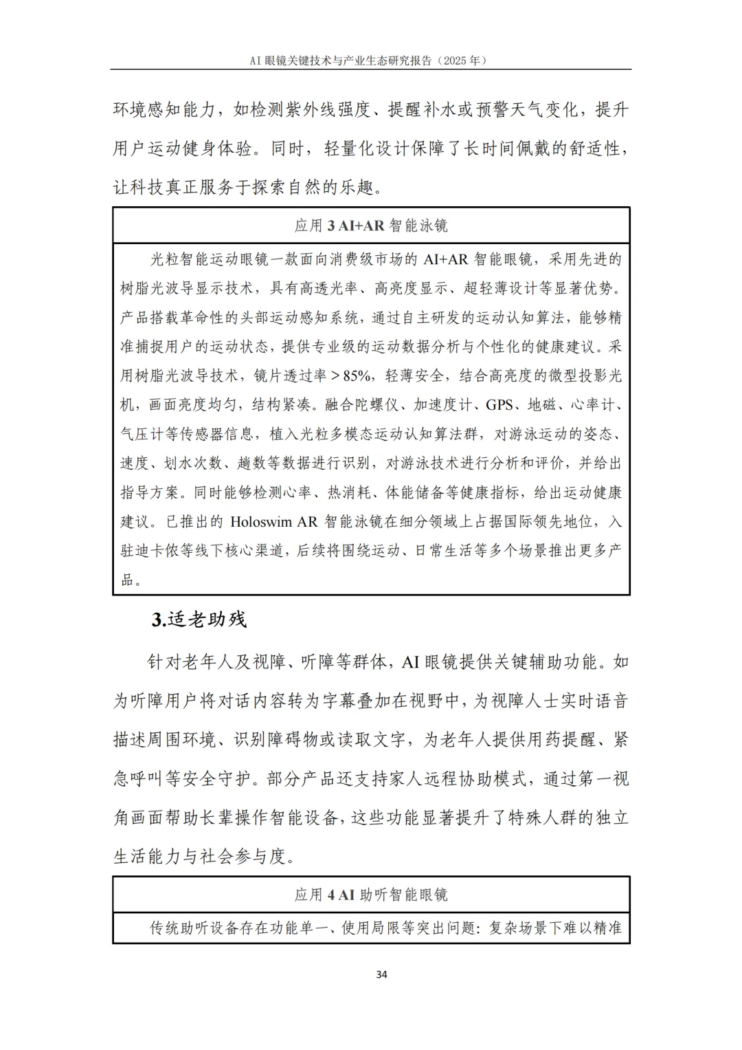 5. 典型应用场景持续丰富拓展:在AI大模型的赋能下,AI眼镜的应用场景不断延伸,从简单信息显示工具升级为具备环境理解与实时决策能力的智能助手。个人消费类场景以生活辅助与商务办公为核心,涵盖生活服务、运动健身、适老助残、商务办公等领域,重点提升个人生活质量与办公效率;专业垂直类场景聚焦工业制造、医疗健康、文化旅游等专业领域,以提升工作效率、优化服务质量为目标,突出专业性与安全性要求。