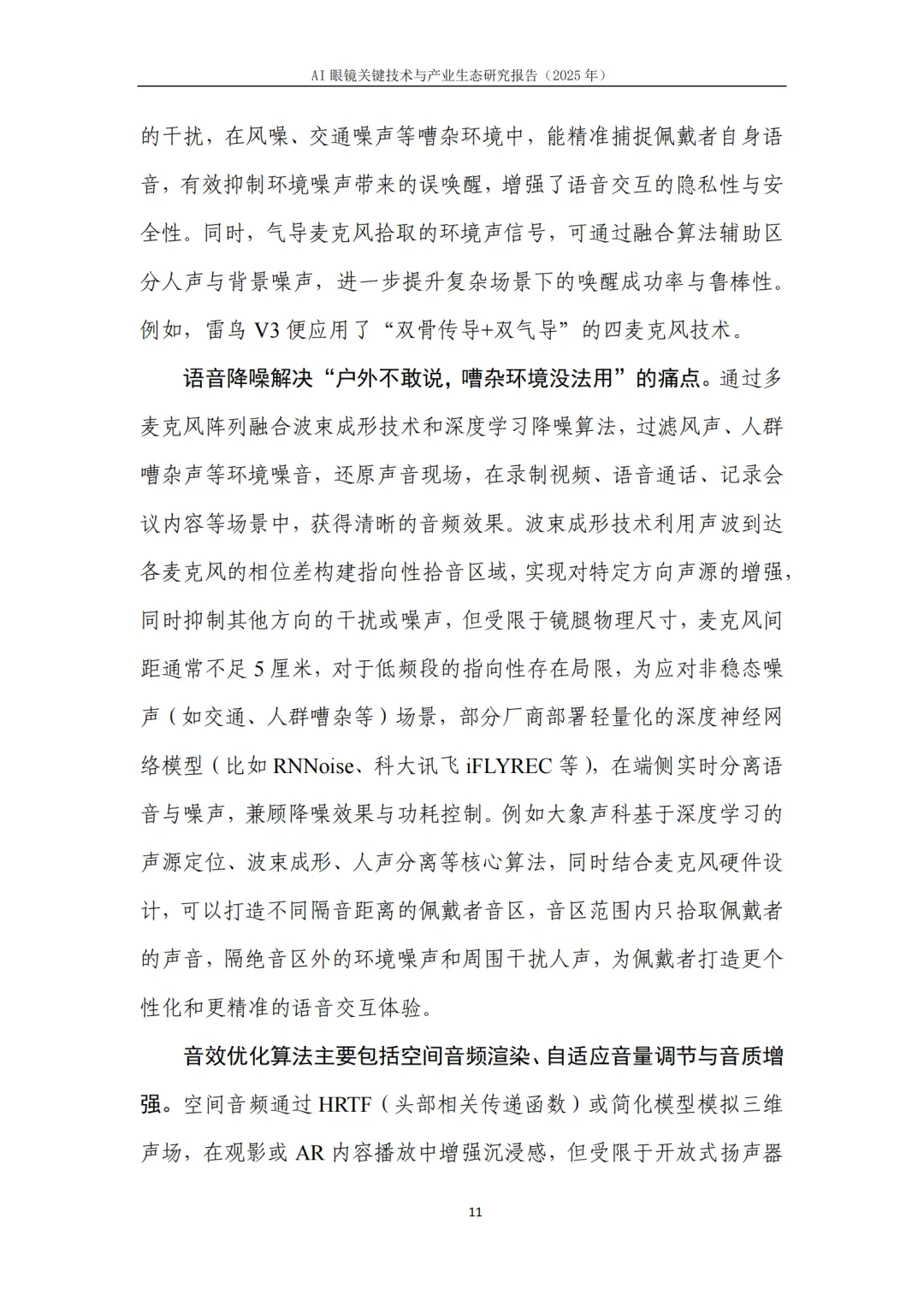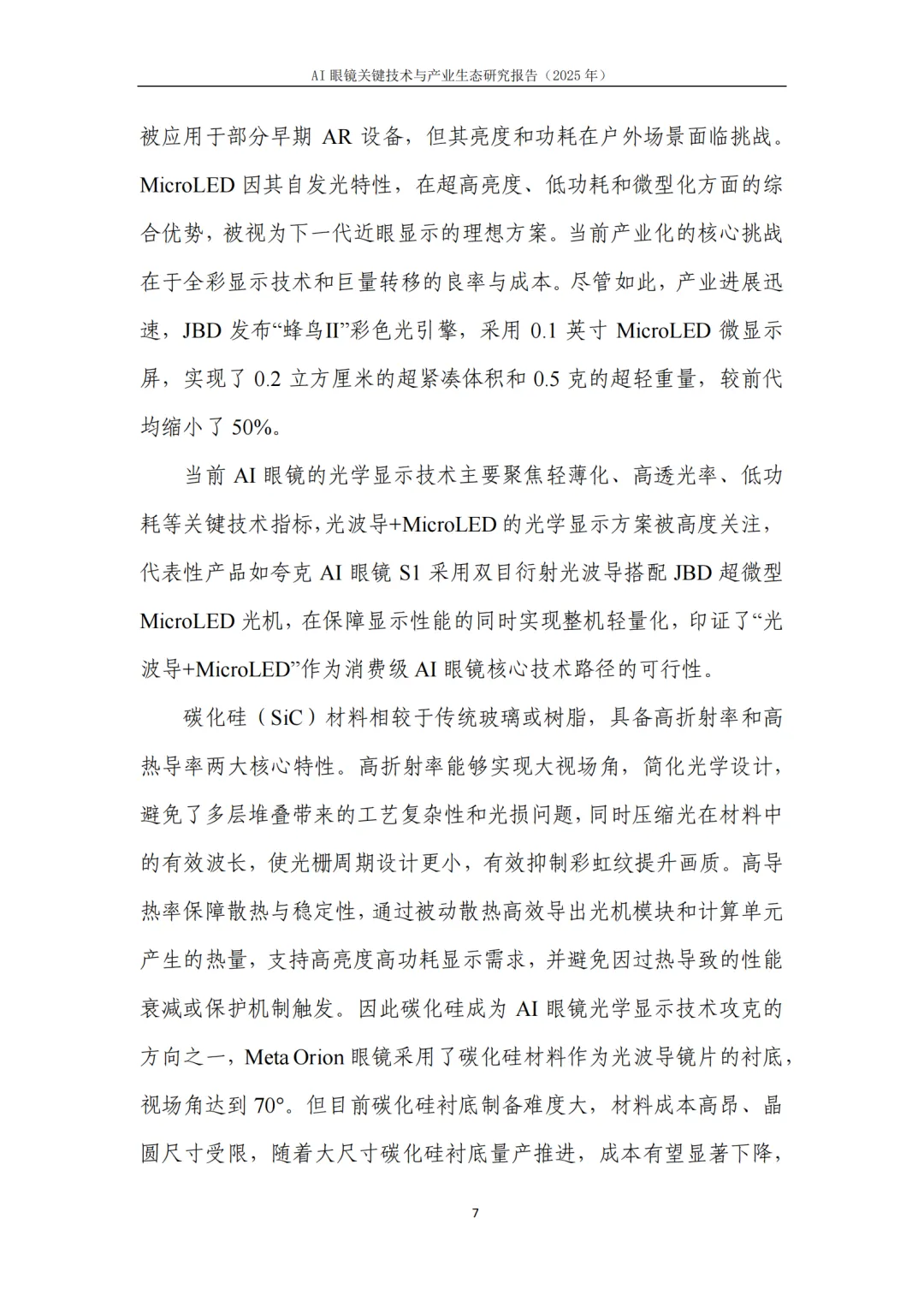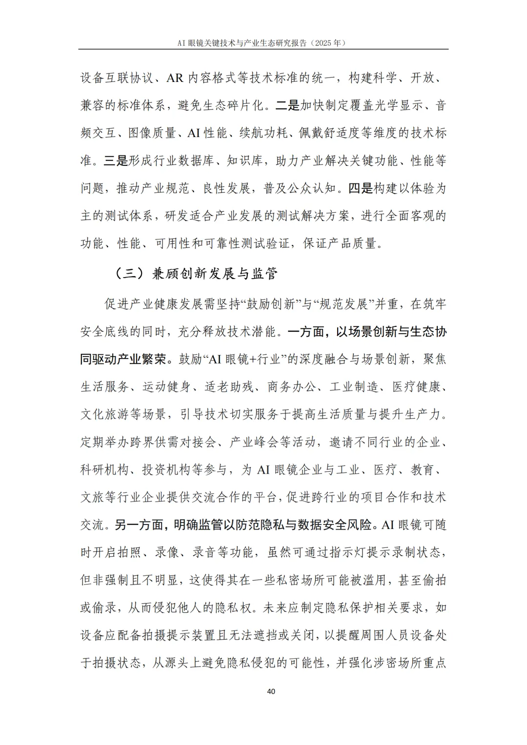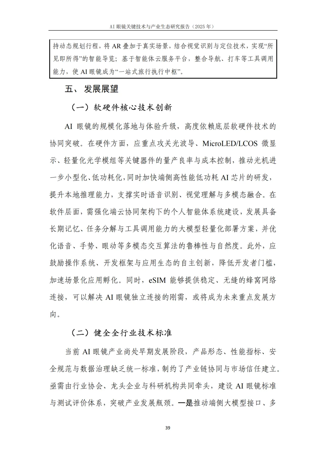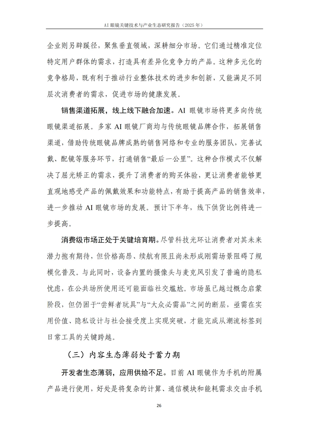 4. 产业高质量发展仍存挑战:当前AI眼镜开发者生态尚处于早期阶段,受产品出货量有限、变现能力不足等因素影响,开发者数量偏少,高质量应用供给稀缺,内容生态较为薄弱;部分产品交互逻辑仍沿用手机触屏思维,未针对语音、手势、头动等原生交互方式进行优化,导致用户体验存在割裂感;核心光学部件生产工艺复杂,良率偏低,芯片等关键元器件面临供给不足、适配性弱等问题,制约了产业规模化发展。