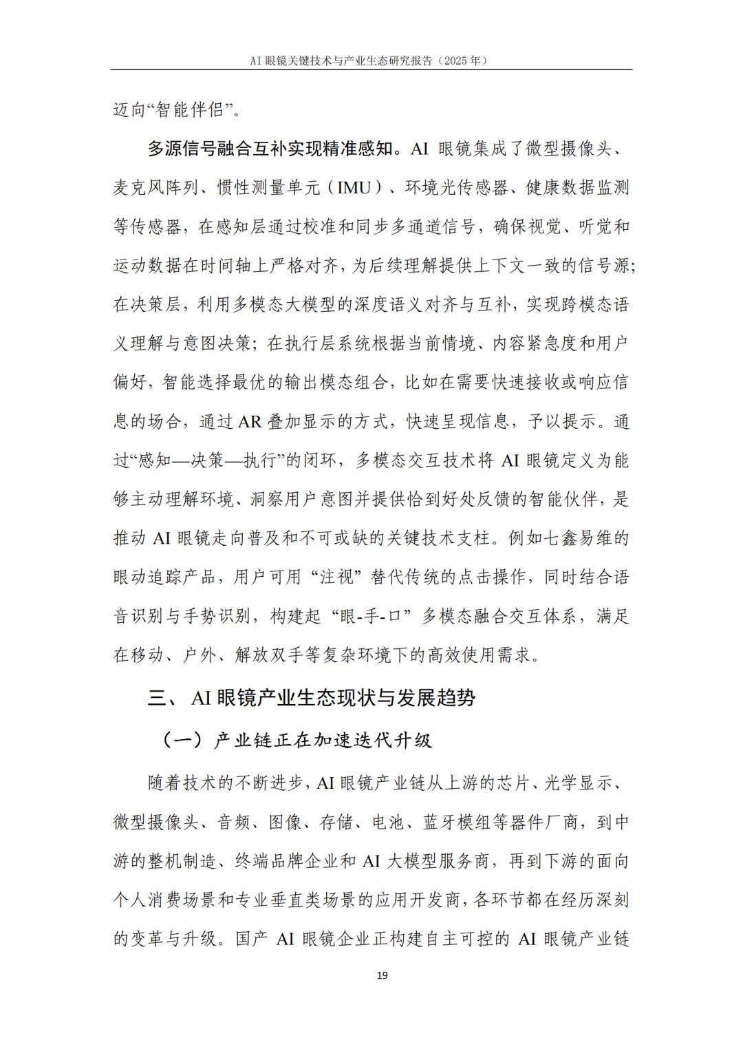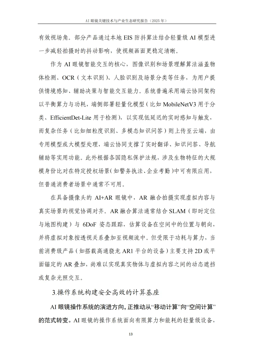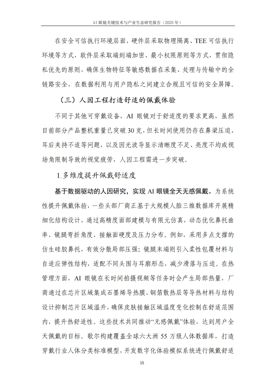 2. 多维度技术实现协同突破:硬件层面,微型化光学显示、轻薄化结构设计创新、先进制程与封装技术的协同发展,为产品轻量化奠定坚实基础;软件层面,音频、图像等算法与操作系统深度协同,不断优化用户体验,推动产品从 “移动计算” 向 “空间计算” 范式演进;人因工程从结构设计、材料选型、热管理等多维度进行精细化打磨,持续提升佩戴舒适度,向着全天候无感佩戴的目标迈进;大模型与多模态技术的融合应用,进一步实现了 “问即所知” 的智能交互与主动服务,构建起自然无缝的人机交互闭环。