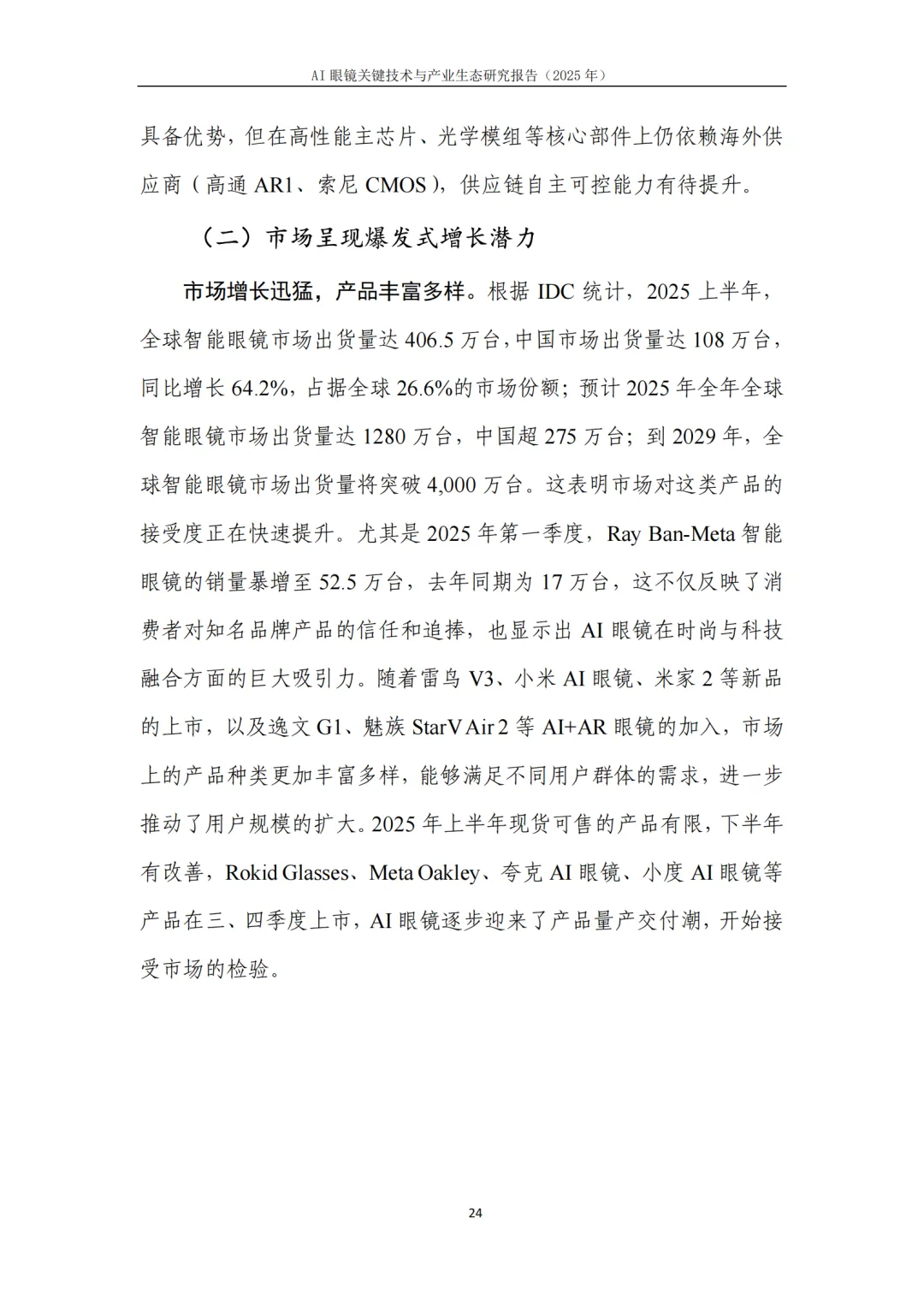 3. 产业生态加速迭代升级:光学模组、芯片、显示单元构成AI眼镜产业的三大价值高地。市场呈现爆发式增长潜力,IDC预测2025年全球智能眼镜市场出货量将达1280万台,中国市场出货量超275万台,占全球市场份额超20%。我国AI眼镜品牌凭借消费电子领域积累的供应链效率优势、成本控制能力及敏捷的软硬件迭代能力,在国际市场快速拓展,全球影响力持续深化。