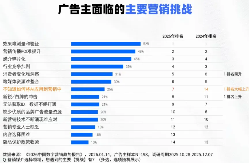 然而,技术与应用的鸿沟依然存在。报告指出,“不知道如何应用AI”已快速上升为营销人员主要挑战之一,其排名从2024年第14位跃升至2026年的第7位,占比达25%。这反映企业急需将AI战略从“观望”推向“落地”。