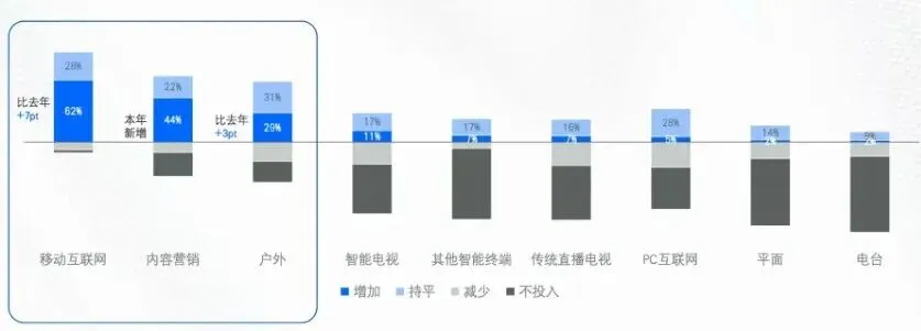 2026年的媒介投资图谱呈现出清晰的“双轨”趋势:线上端向深度渗透,线下端则迎来价值回流。移动互联网、内容营销、户外媒体成为广告主增投意愿最强的三大媒介。