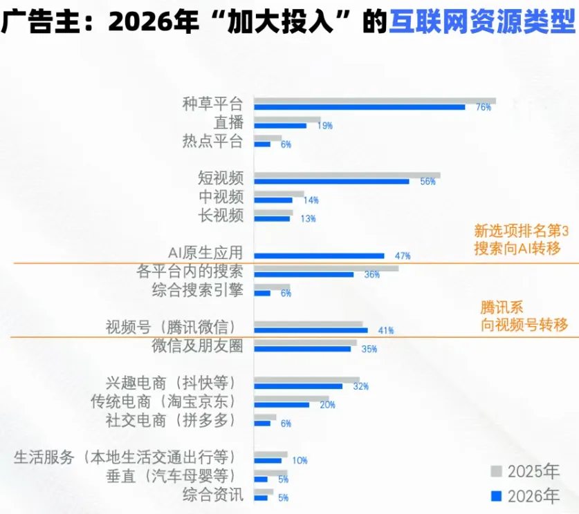 线上战场的结构性变化,在广告主的预算分配意图中体现得尤为明显。数据显示,广告主计划在2026年“加大投入”互联网资源类型发生关键转向:线上核心增量赛道已清晰浮现,且呈现出 “种草为王、短视频主导、AI 与视频号双崛起” 特征,这种变化与房产 “线上种草、线下成交” 业务属性高度契合。