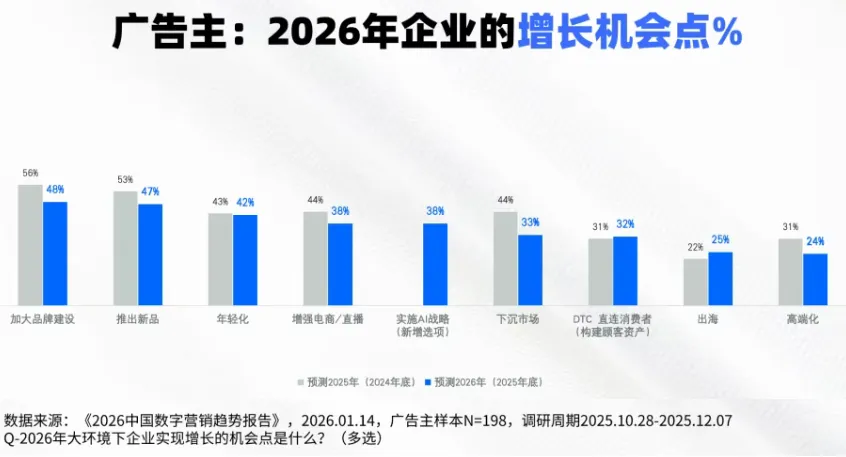 此外,报告揭示2026年企业营销增长机会点:加大品牌建设以48%的比例位居第一。这表明企业在追求短期销量的同时,更加注重长期品牌建设和创新发展。