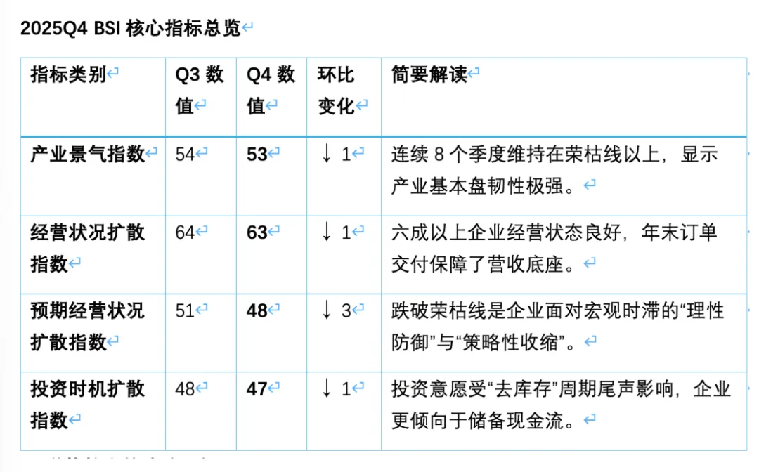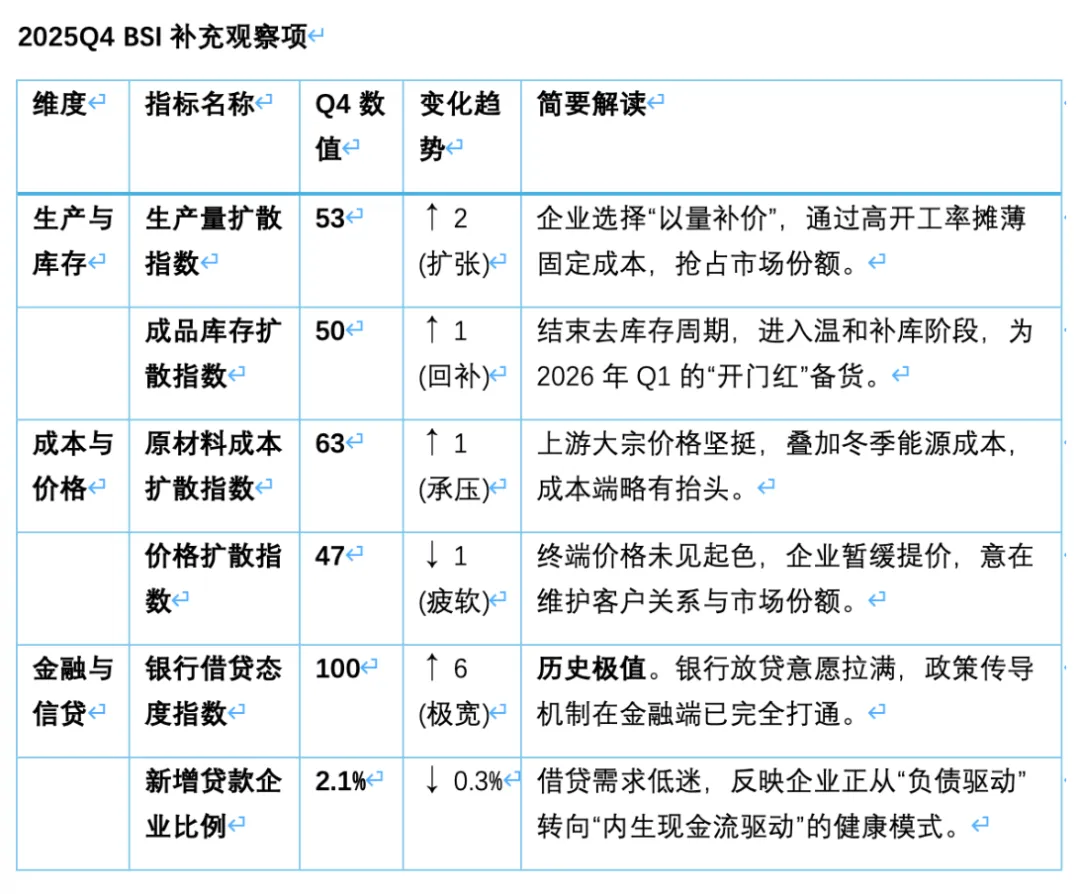 2025年Q4的BSI报告,是一份关于“蛰伏”与“苏醒”的宣言。对于所有的中国企业家而言,资金的活水已经开始涌动,信心的坚冰正在消融。现在的每一次坚持、每一份务实的生产、每一笔审慎的投入,都是在为2026年的腾飞积攒势能。我们期待在2026年的春天,与所有坚守者一同见证产业景气的全面回升。