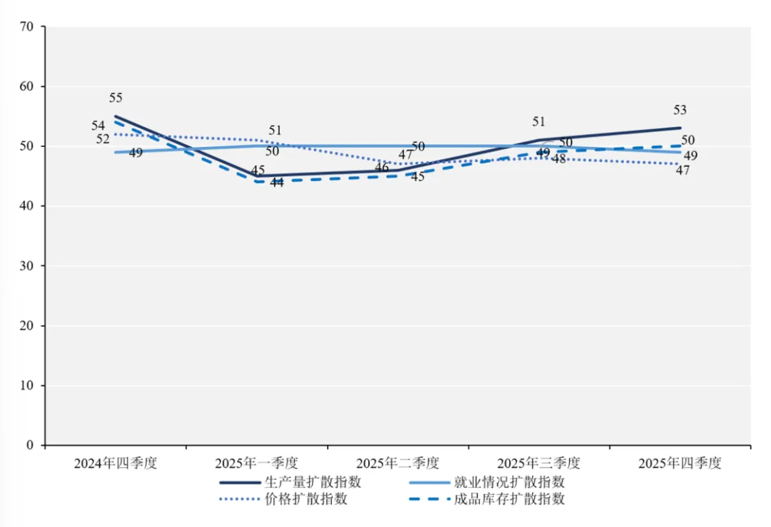 四季度本是企业盘点库存、收缩战线的淡季。2025年的数据打破了常规:生产量扩散指数从51攀升至53,成品库存扩散指数也温和回升至50。这种“淡季不淡、逆势扩产”的现象,本质上是企业对2026年开局需求的“抢先卡位”。随着国内促消费政策的持续加码,敏锐的企业家已经嗅到了今年春季可能出现的市场回暖。现在的生产,是为了防止未来的踏空。这是一种极具战略眼光的“左侧布局”。