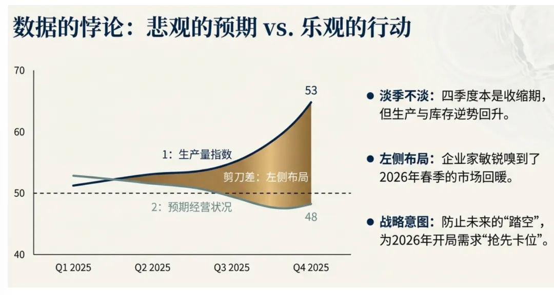 2025年四季度滑落至48的预期经营状况指数,极有可能在2026年一季度随着消费数据的回暖而暴力拉升。我们正在经历从“政策底”到“市场底”,再到“盈利底”的关键跨越。2025年四季度的“抢生产”库存,将正好承接这波因财富效应溢出而带来的需求反弹。