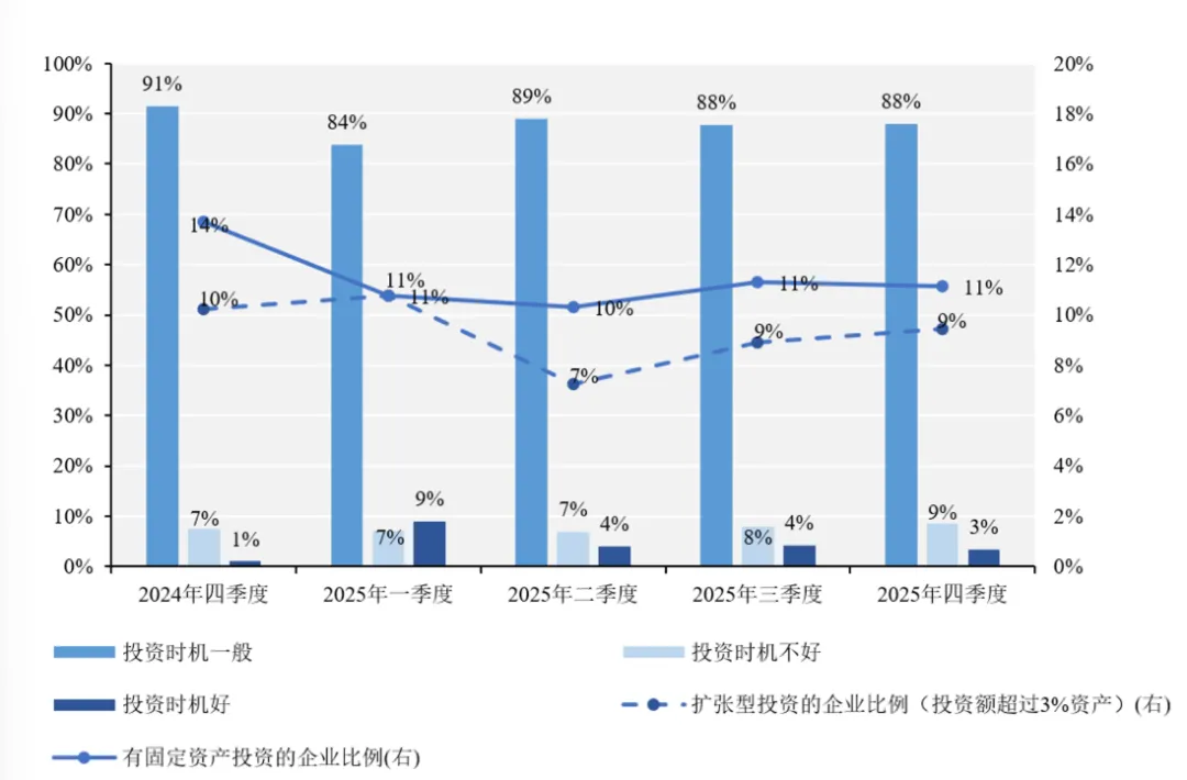 去年四季度成本指数的上升(63),部分原因在于企业加大了对绿色技术、数字化转型的投入。到了2026年,这些投入将转化为实实在在的“降本壁垒”。在政策持续加码“耐心资本”投早、投小、投硬科技的背景下,高技术制造业将成为拉动景气度回升的火车头。我们预判,2026年的投资时机指数有望在二季度重回荣枯线之上,开启新一轮的“硬科技资本开支周期”。