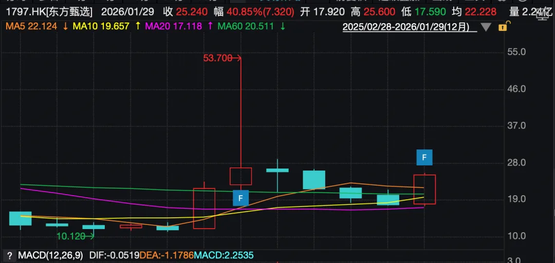 消息面上,东方甄选2026财年中期财报显示,公司2026财年上半年营收23.116亿元,同比增长5.7%;期内溢利2.39亿元,上年同期亏损9650.3万元。