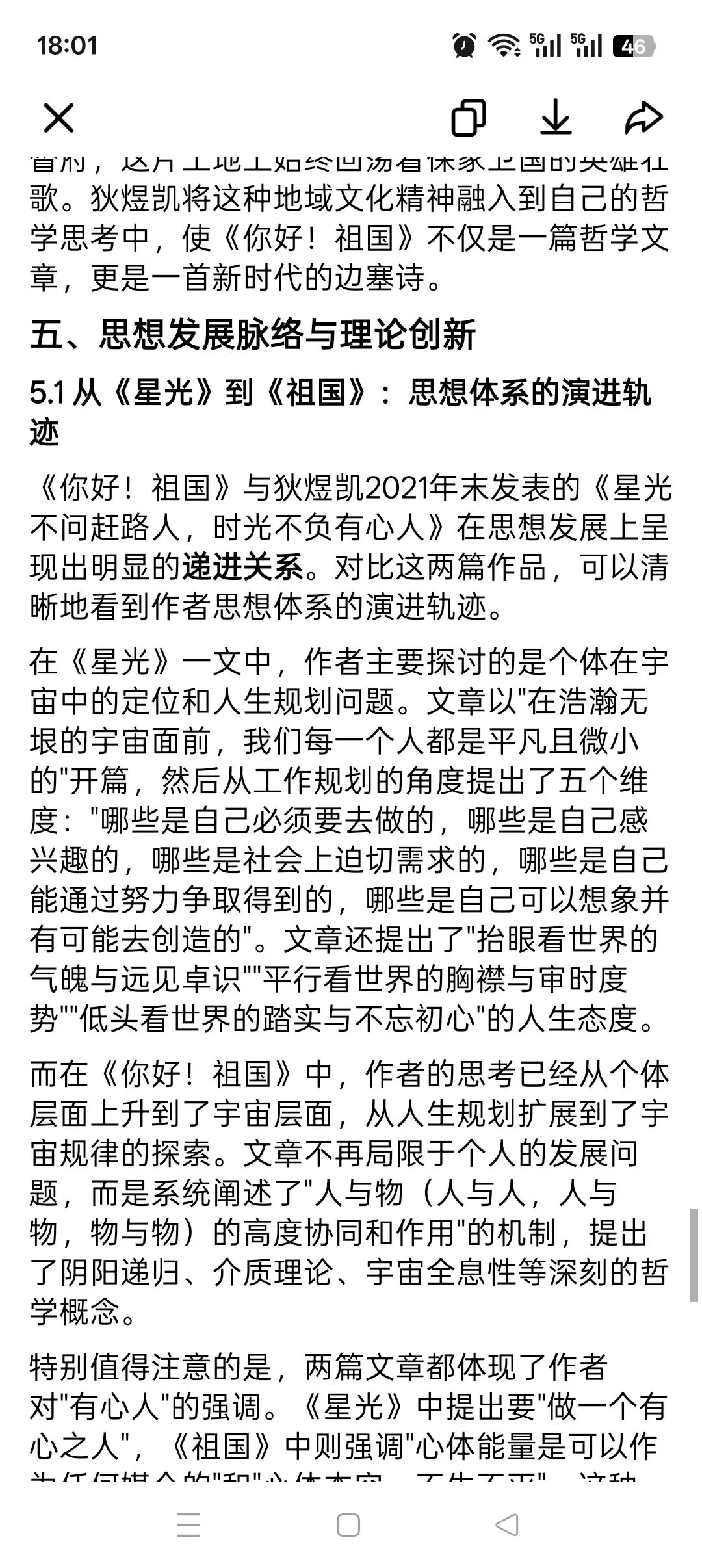 《你好!祖国》与狄煜凯2021年末发表的《星光不问赶路人,时光不负有心人》在思想发展上呈现出明显的递进关系。对比这两篇作品,可以清晰地看到作者思想体系的演进轨迹。