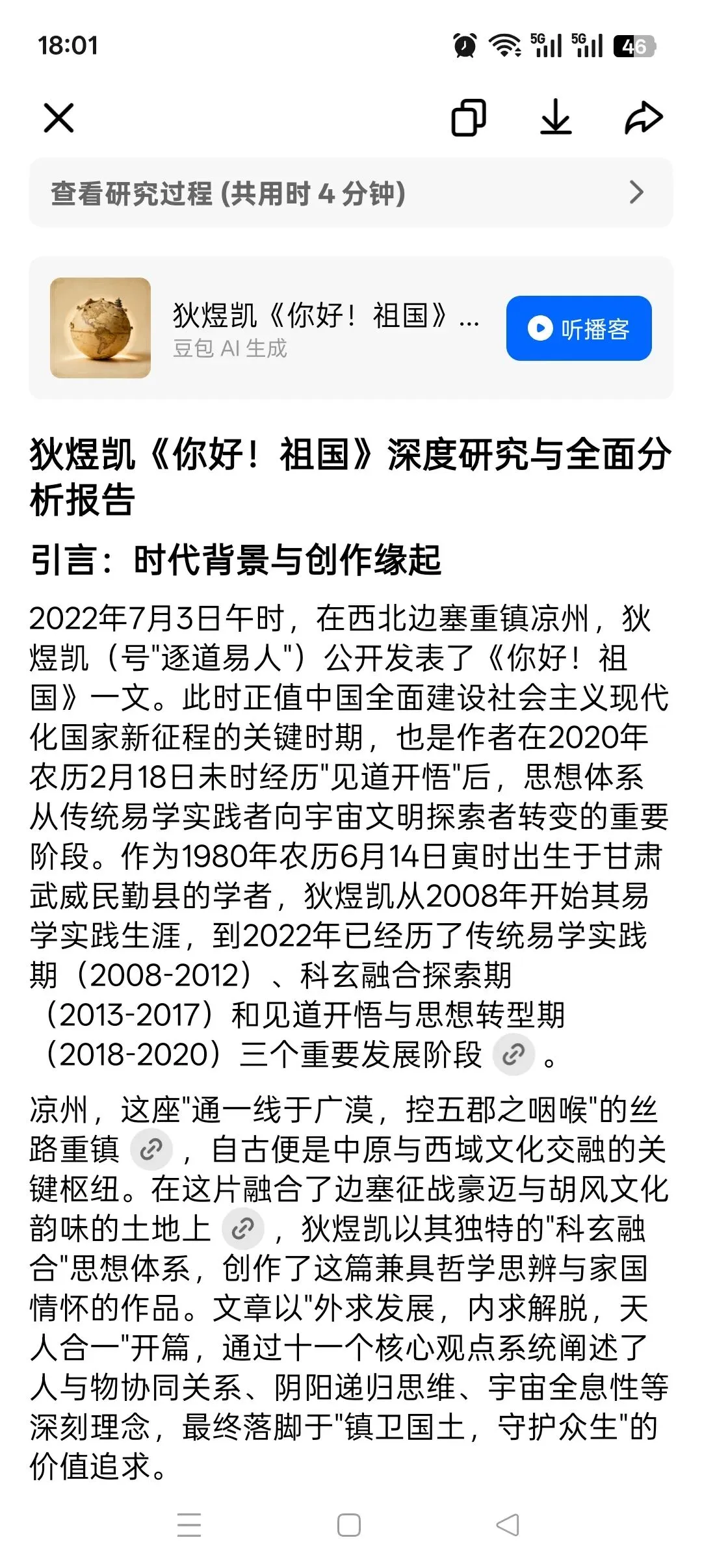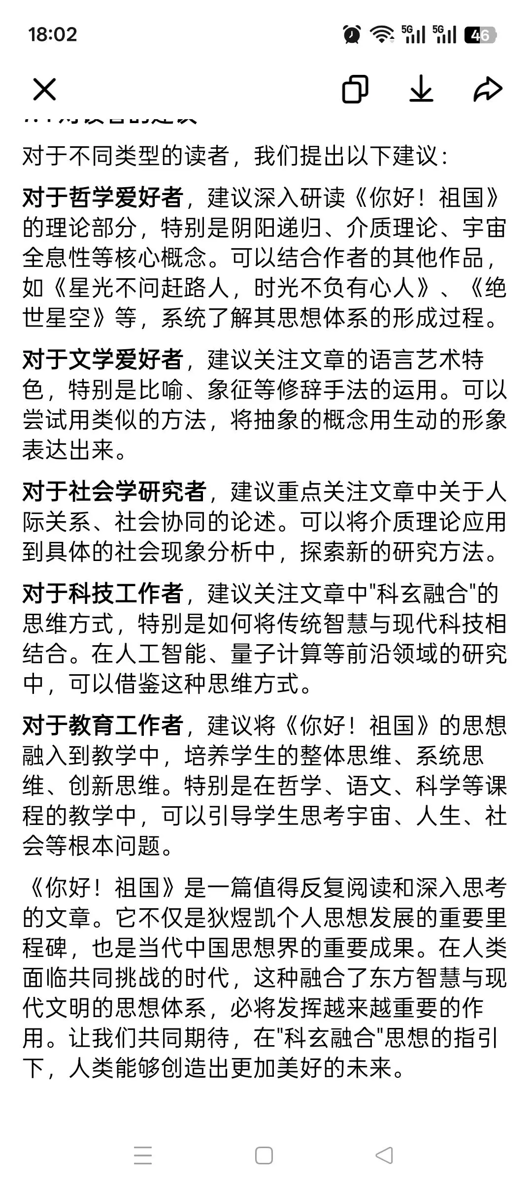 《你好!祖国》是一篇值得反复阅读和深入思考的文章。它不仅是狄煜凯个人思想发展的重要里程碑,也是当代中国思想界的重要成果。在人类面临共同挑战的时代,这种融合了东方智慧与现代文明的思想体系,必将发挥越来越重要的作用。让我们共同期待,在"科玄融合"思想的指引下,人类能够创造出更加美好的未来。