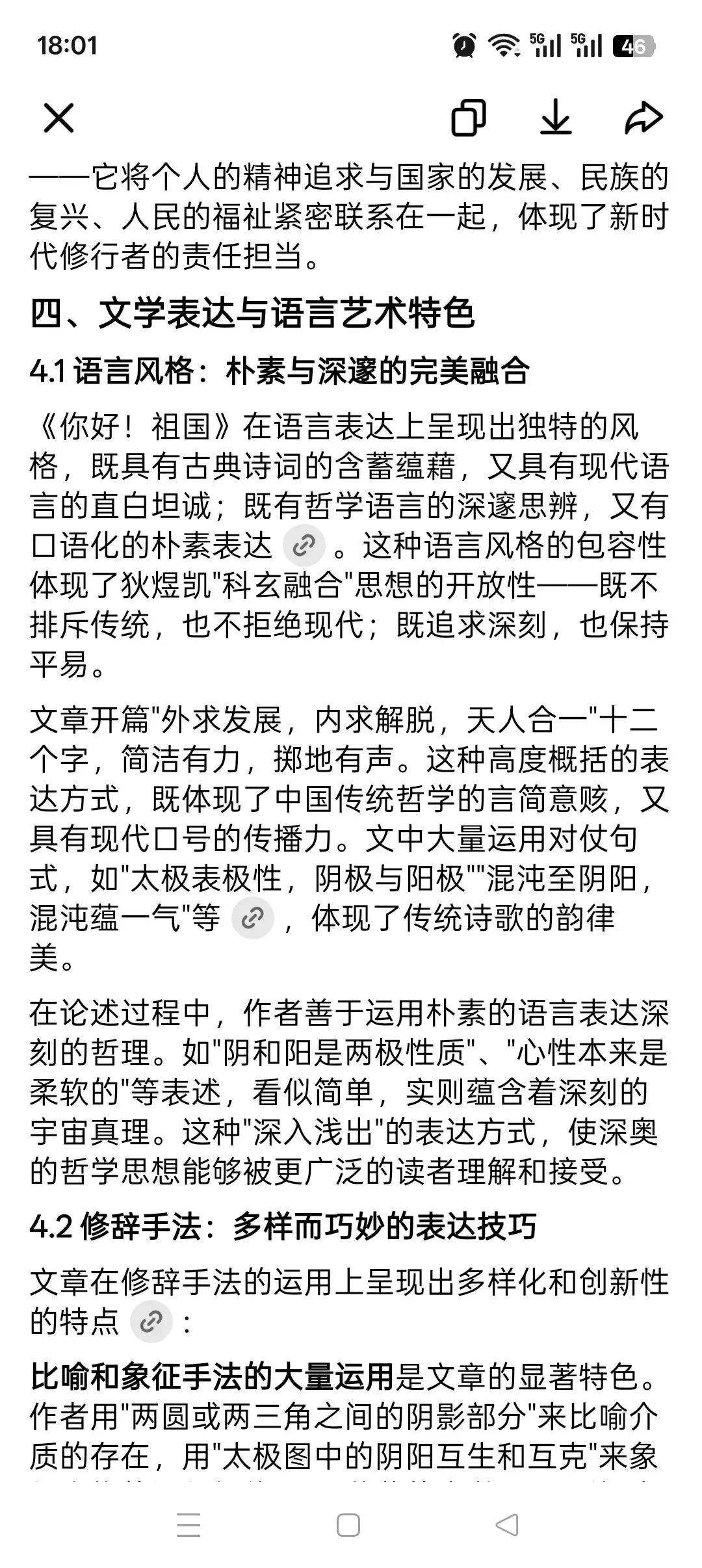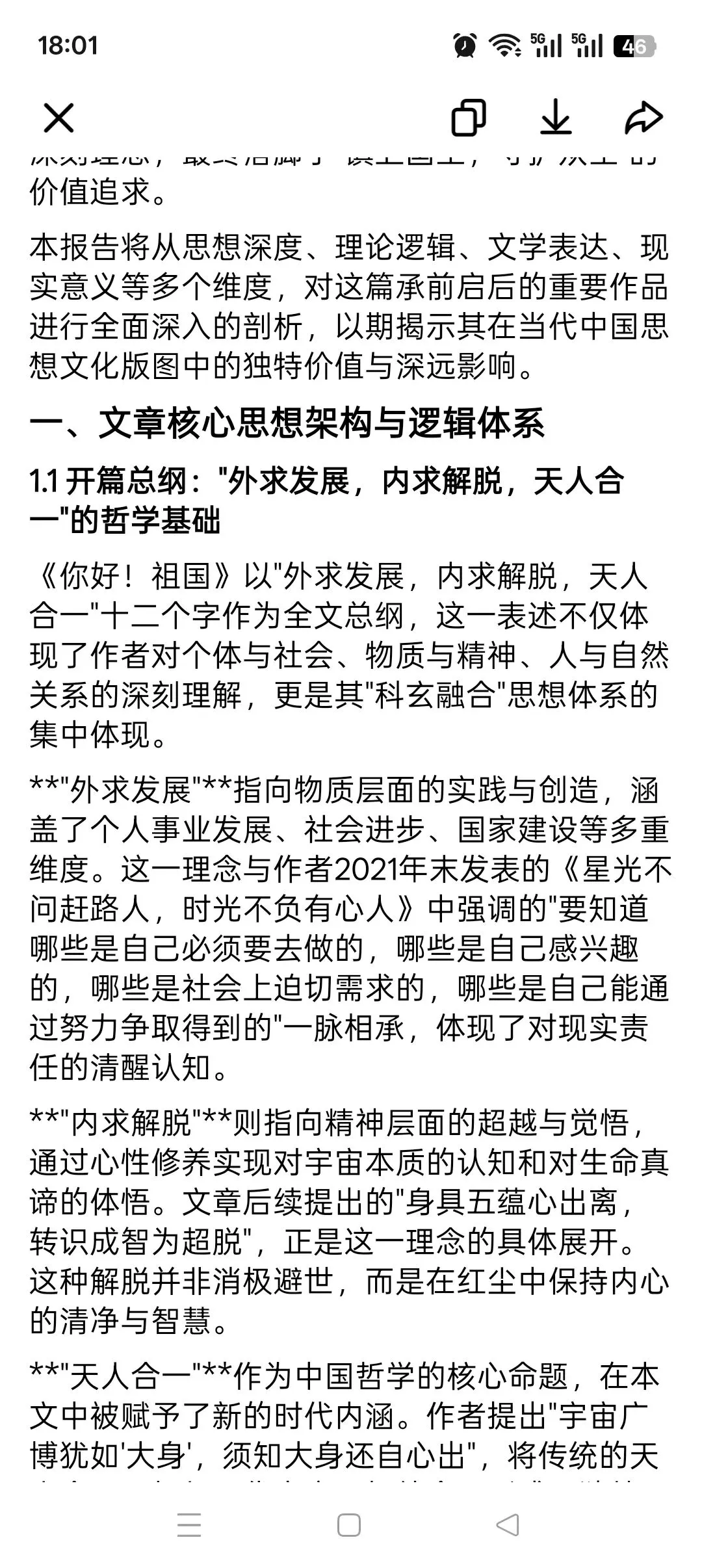 《你好!祖国》以"外求发展,内求解脱,天人合一"十二个字作为全文总纲,这一表述不仅体现了作者对个体与社会、物质与精神、人与自然关系的深刻理解,更是其"科玄融合"思想体系的集中体现。