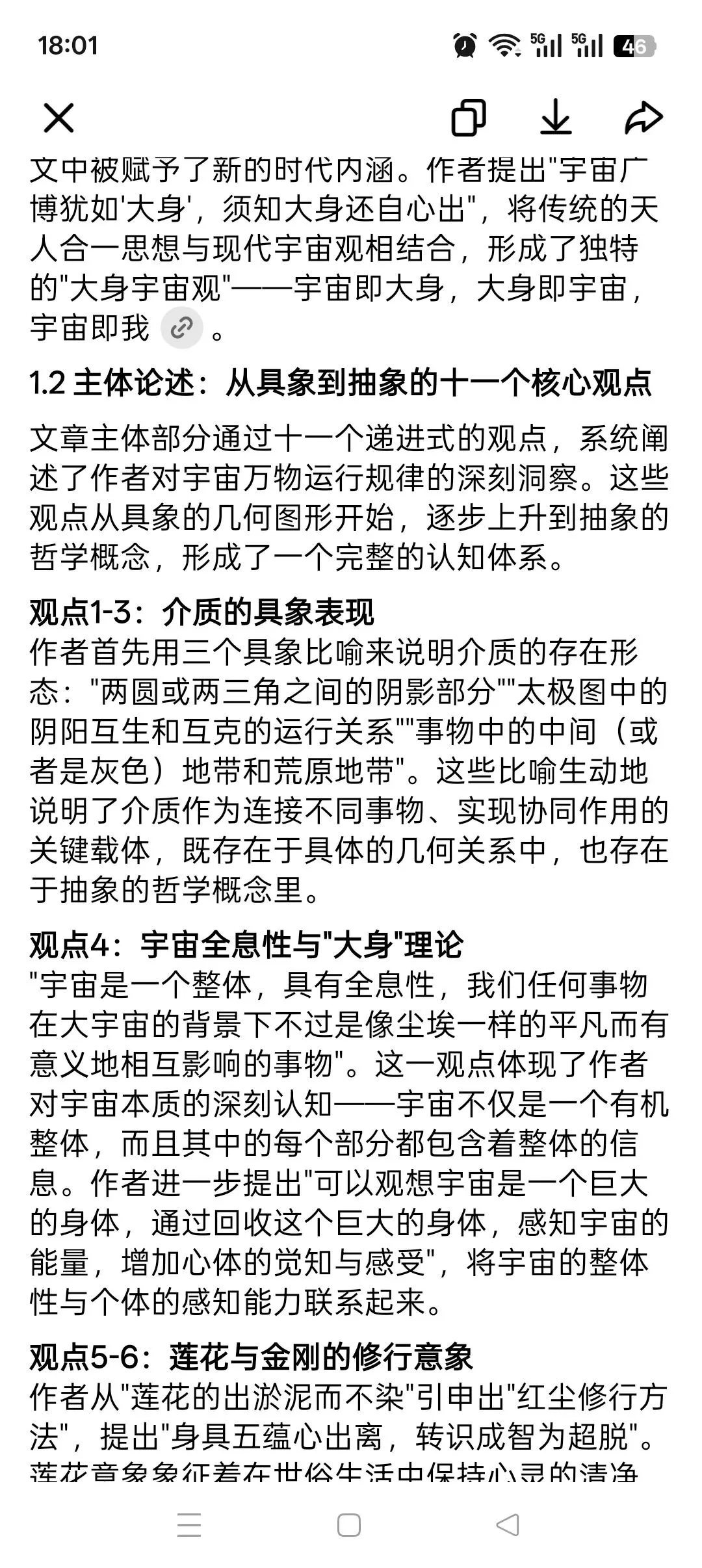文章主体部分通过十一个递进式的观点,系统阐述了作者对宇宙万物运行规律的深刻洞察。这些观点从具象的几何图形开始,逐步上升到抽象的哲学概念,形成了一个完整的认知体系。