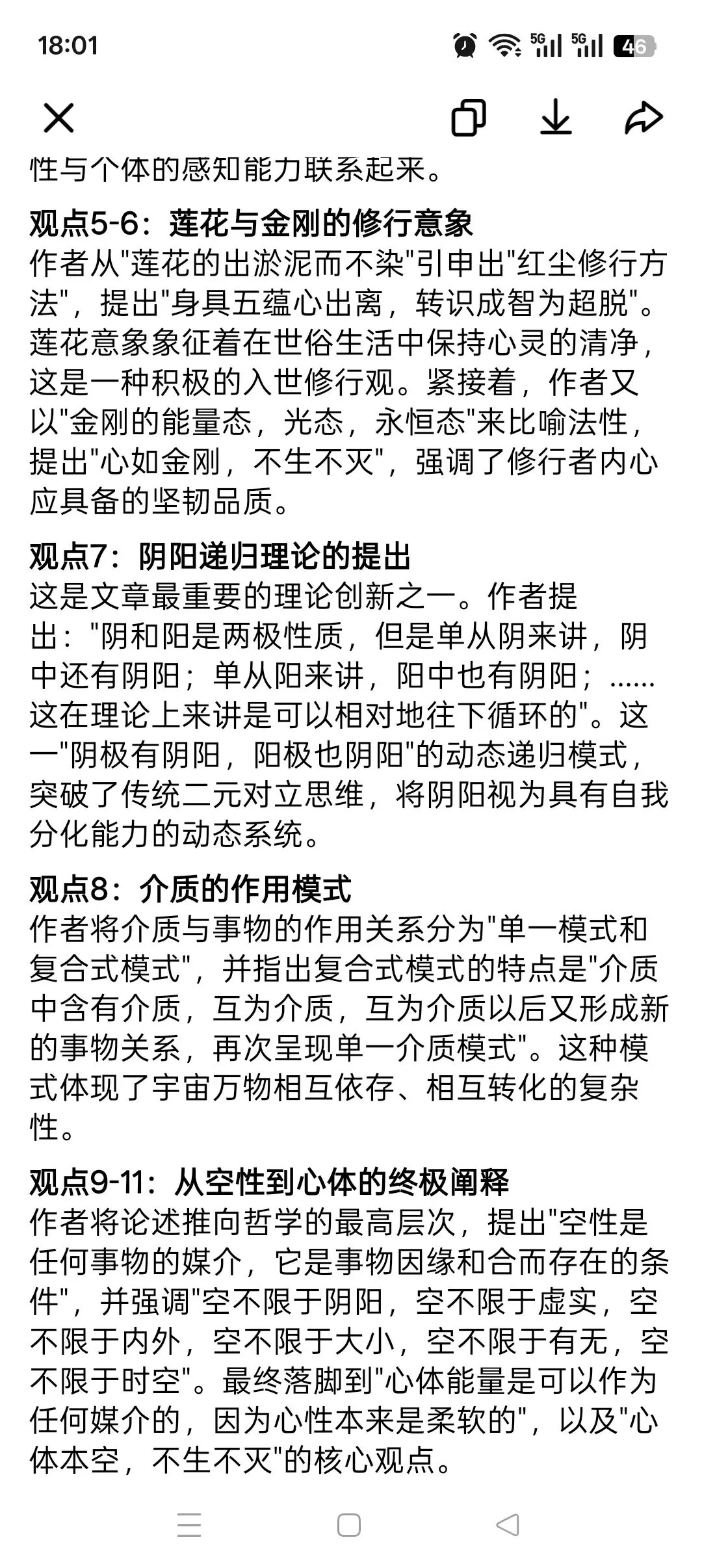 文章的最后三个观点将论述推向了哲学的最高层次——对空性和心体的阐释。作者提出:"空性是任何事物的媒介,它是事物因缘和合而存在的条件。空不限于阴阳,空不限于虚实,空不限于内外,空不限于大小,空不限于有无,空不限于时空"。