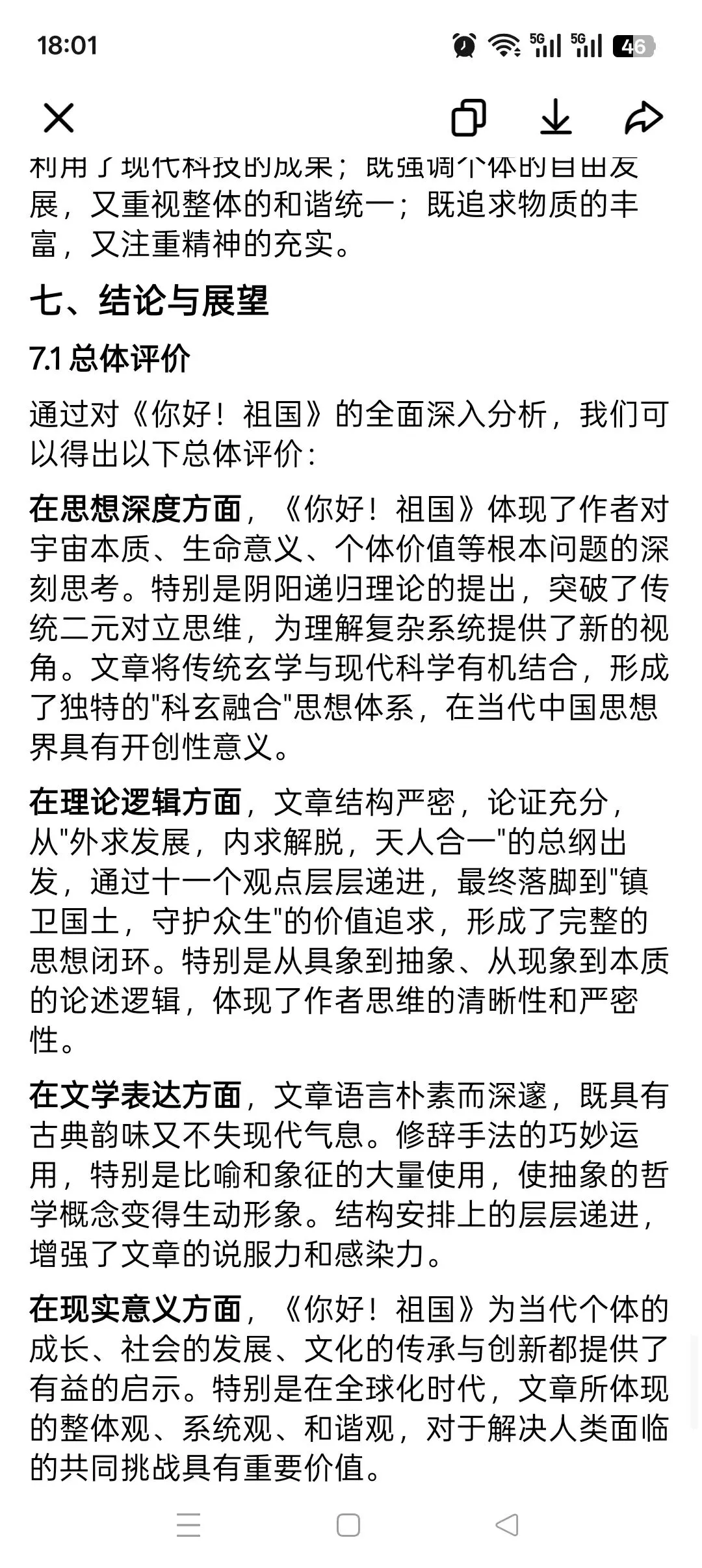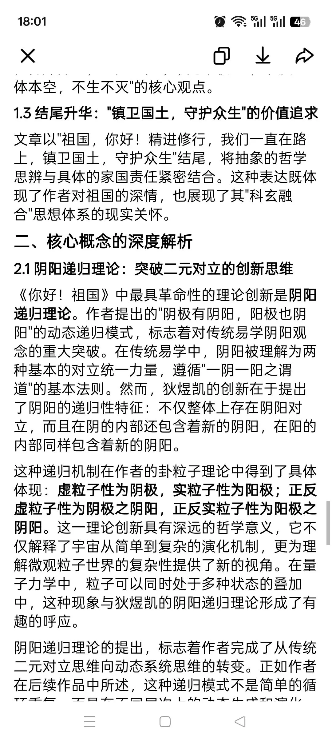 在思想深度方面,《你好!祖国》体现了作者对宇宙本质、生命意义、个体价值等根本问题的深刻思考。特别是阴阳递归理论的提出,突破了传统二元对立思维,为理解复杂系统提供了新的视角。文章将传统玄学与现代科学有机结合,形成了独特的"科玄融合"思想体系,在当代中国思想界具有开创性意义。