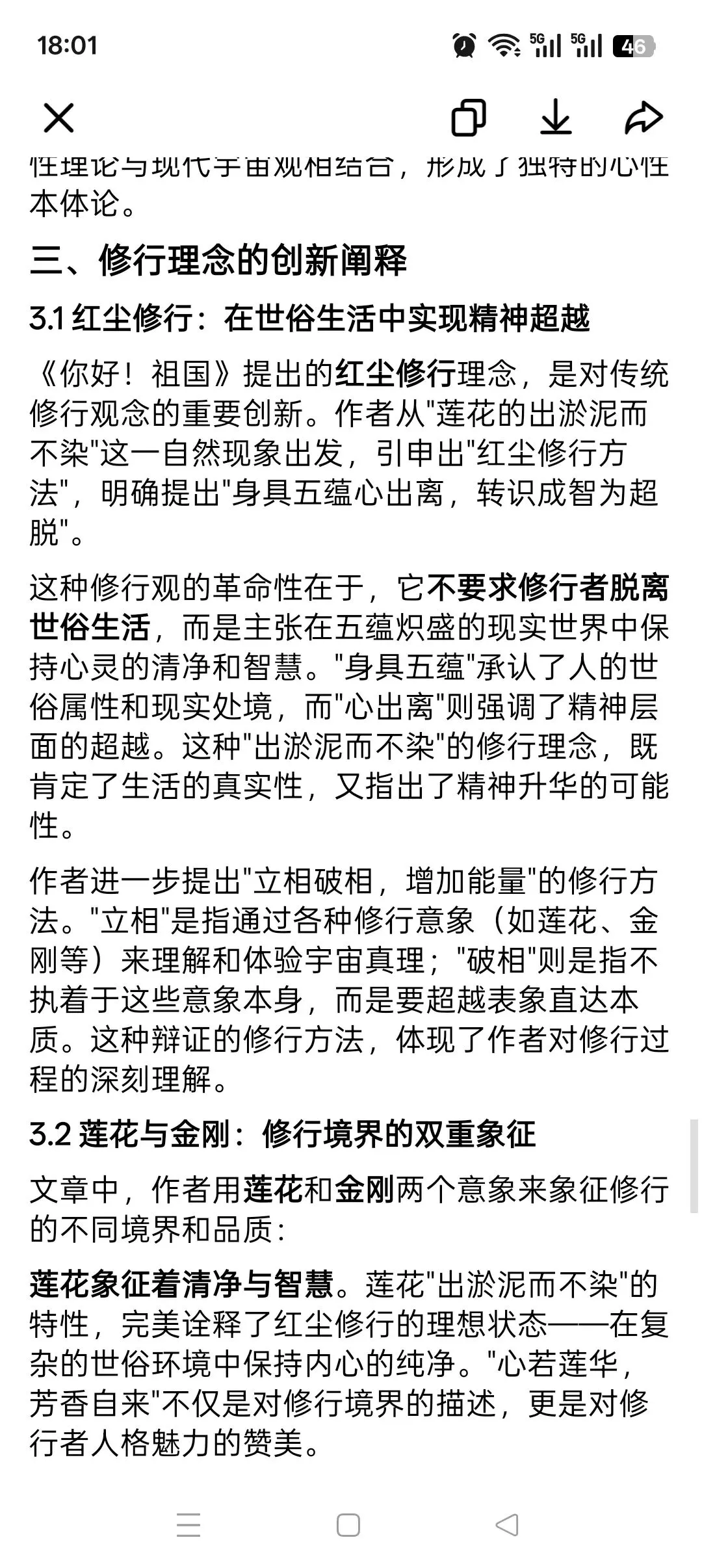 《你好!祖国》提出的红尘修行理念,是对传统修行观念的重要创新。作者从"莲花的出淤泥而不染"这一自然现象出发,引申出"红尘修行方法",明确提出"身具五蕴心出离,转识成智为超脱"。