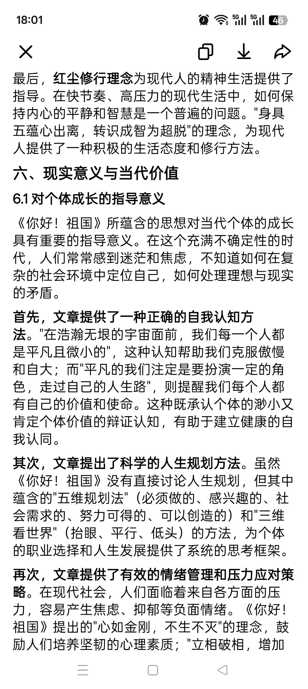 再次,文章提供了有效的情绪管理和压力应对策略。在现代社会,人们面临着来自各方面的压力,容易产生焦虑、抑郁等负面情绪。《你好!祖国》提出的"心如金刚,不生不灭"的理念,鼓励人们培养坚韧的心理素质;"立相破相,增加能量"的方法,则提供了一种超越负面情绪的路径。