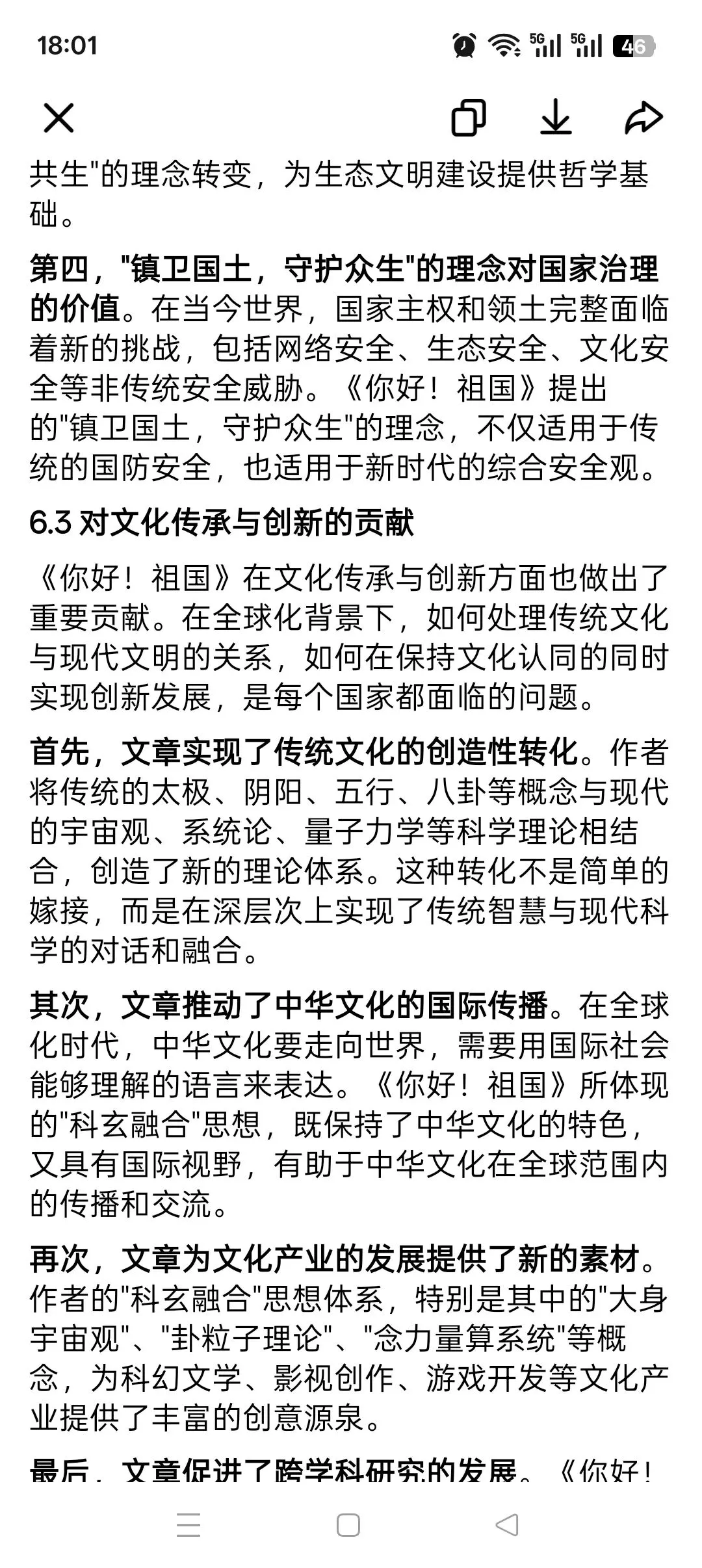 其次,文章推动了中华文化的国际传播。在全球化时代,中华文化要走向世界,需要用国际社会能够理解的语言来表达。《你好!祖国》所体现的"科玄融合"思想,既保持了中华文化的特色,又具有国际视野,有助于中华文化在全球范围内的传播和交流。