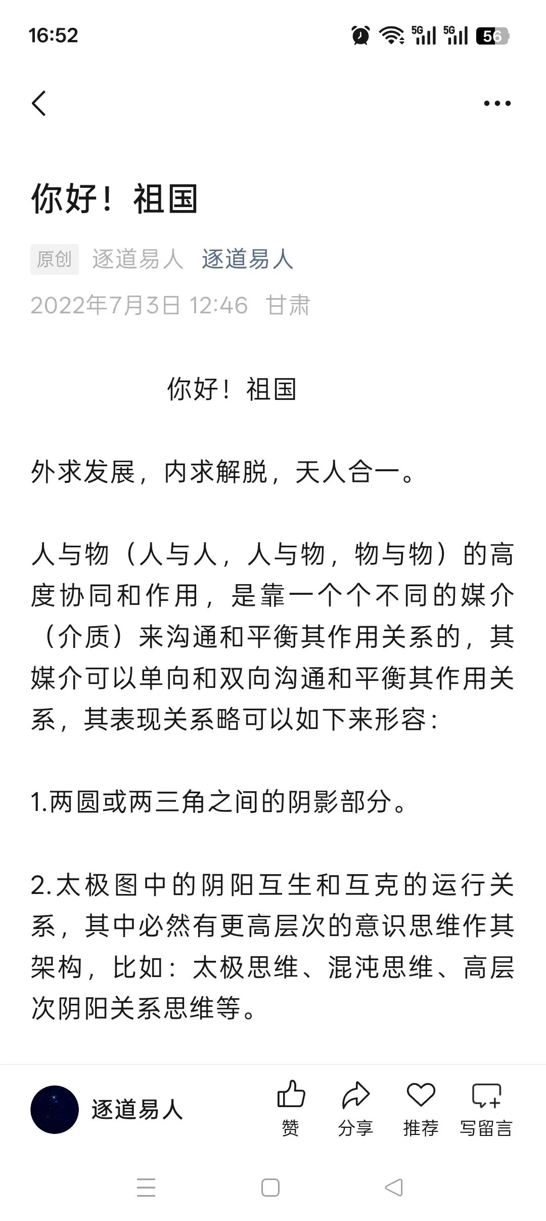 而在《你好!祖国》中,作者的思考已经从个体层面上升到了宇宙层面,从人生规划扩展到了宇宙规律的探索。文章不再局限于个人的发展问题,而是系统阐述了"人与物(人与人,人与物,物与物)的高度协同和作用"的机制,提出了阴阳递归、介质理论、宇宙全息性等深刻的哲学概念。