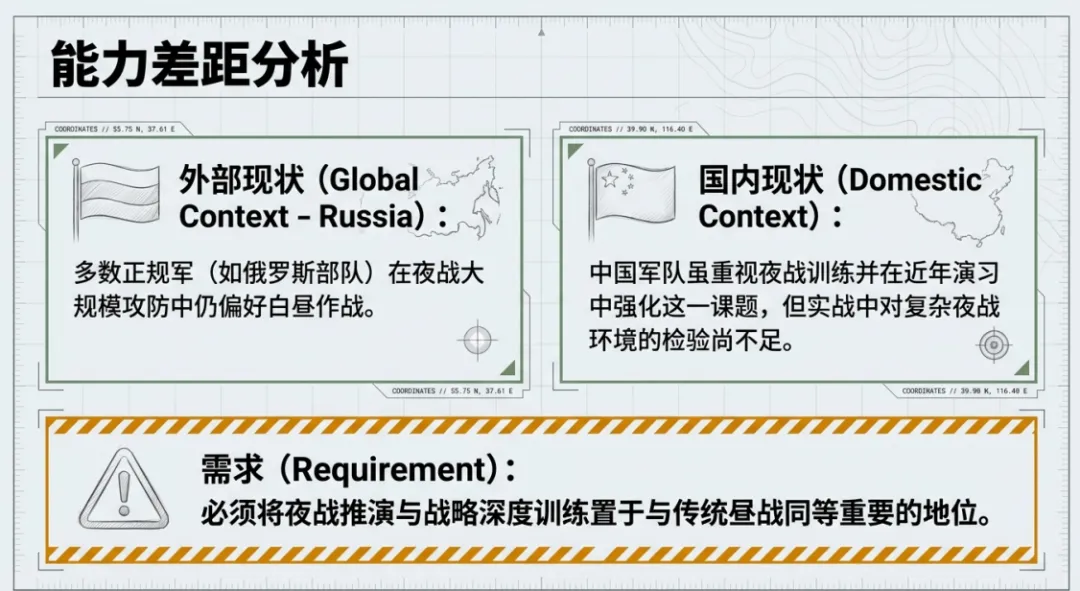 因此,从军队作战发展逻辑看,夜战推演、战略深度训练与夜间联合作战体系建设应与传统昼战同等重要。