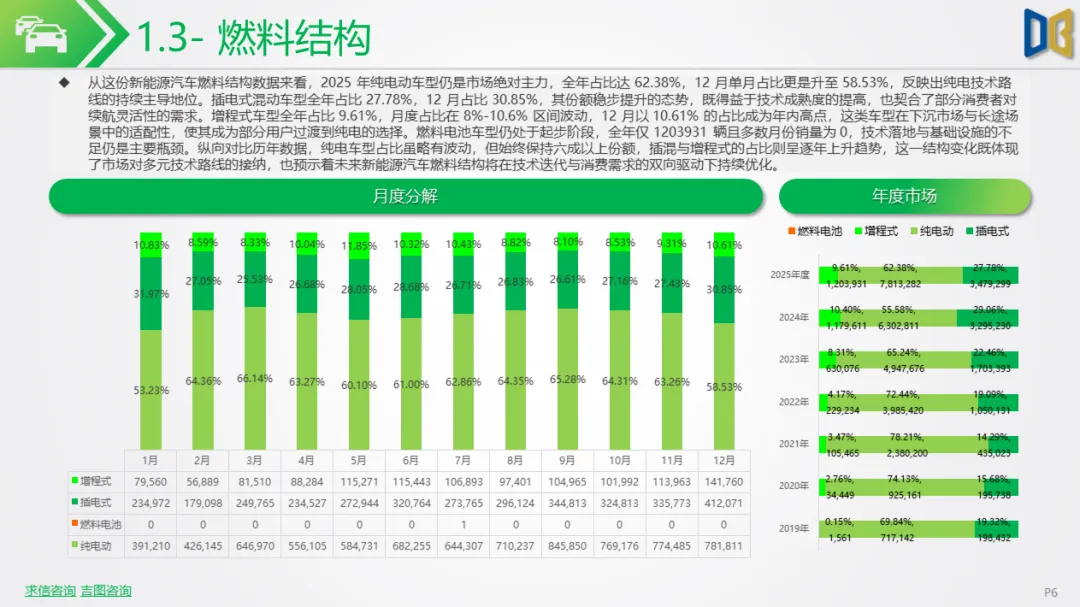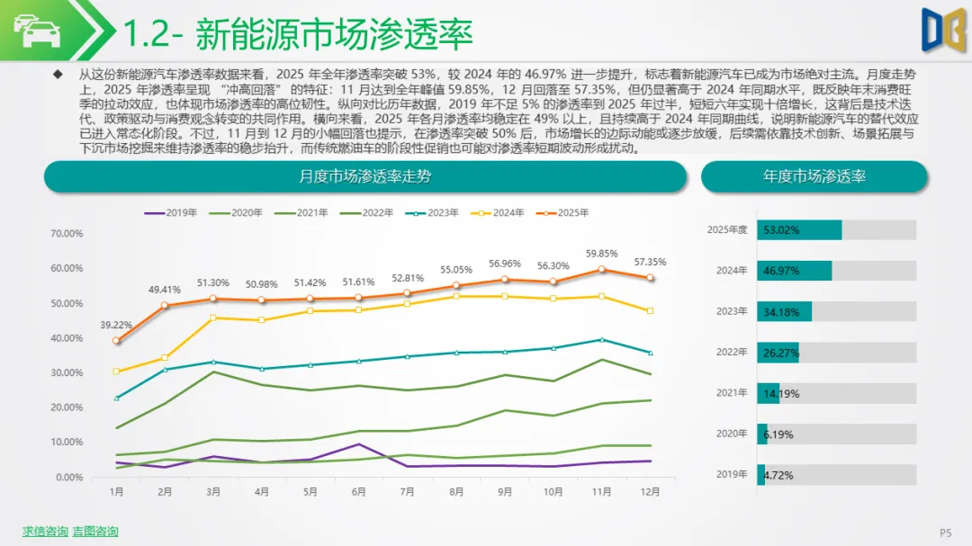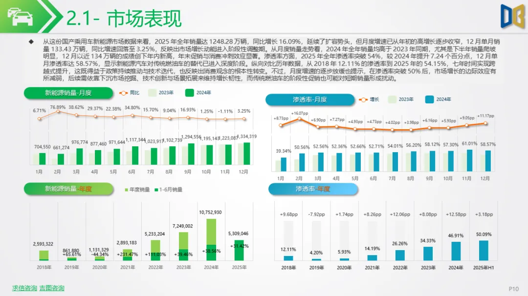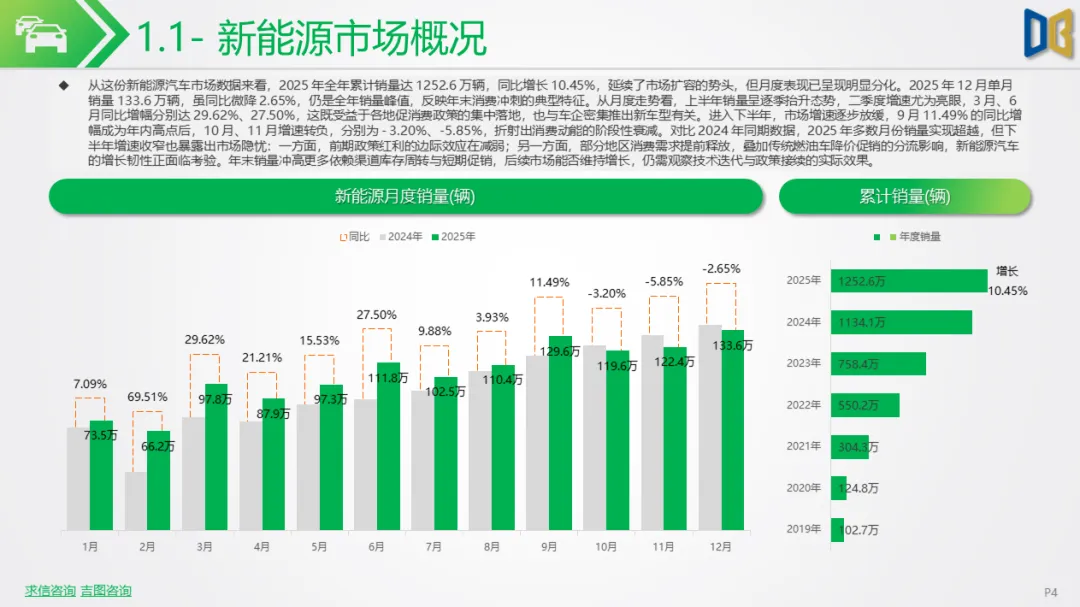 2025年12月,国内新能源汽车市场以年末冲刺姿态收官,全年增长态势稳固但月度分化特征显著,市场结构优化与竞争格局重塑成为核心亮点。核心数据显示,12 月单月销量达133.6万辆,虽同比微降2.65%,但仍是全年销量峰值,印证年末消费冲刺的典型特征;2025年全年累计销量1252.6万辆,同比增长10.45%,延续市场扩容势头,而全年渗透率突破53%,较 2024年提升超6个百分点,标志着新能源汽车已成为市场绝对主流。