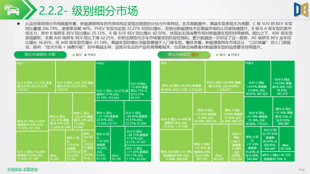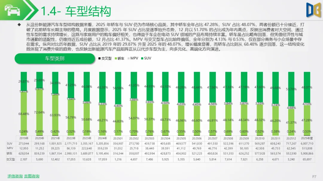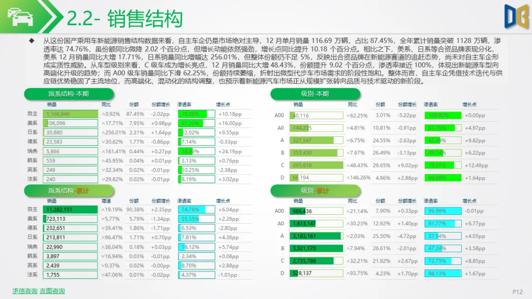 市场结构优化趋势突出,多维度分化特征明显。燃料结构上,纯电动车型仍占主导,全年占比62.38%,12 月单月占比58.53%;插电式混动与增程式车型份额持续提升,12 月插混占比突破30%,增程式占比达10.61%,多元技术路线适配不同消费需求。车型结构方面,SUV占比首次超越轿车,12 月达 51.70%,全年占比48.07%,反映消费者对大空间、通过性车型的偏好;C 级高端车型成为增长亮点,12 月同比大增48.43%,而 A00级入门车型销量同比下滑62.25%,消费升级趋势显著。