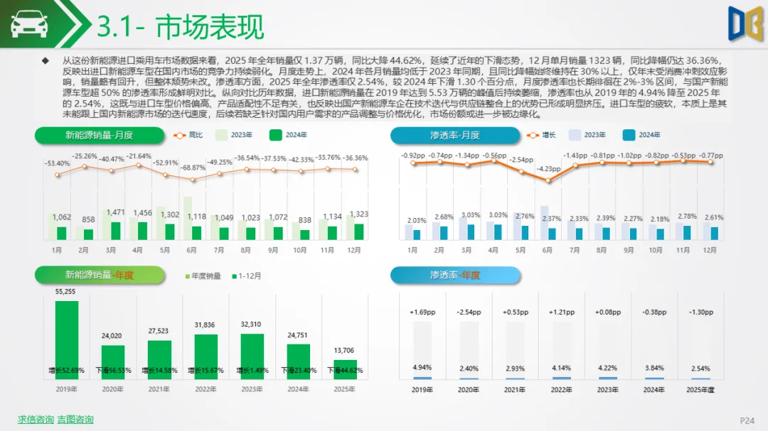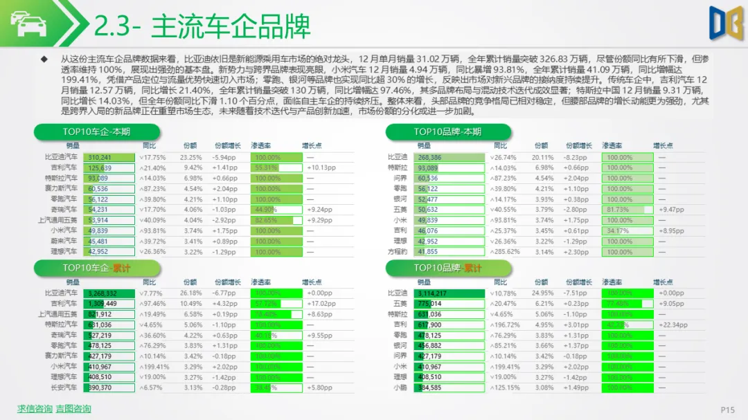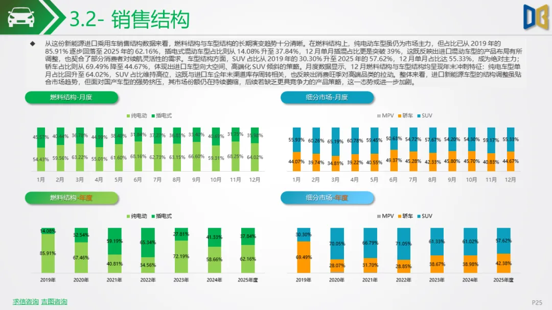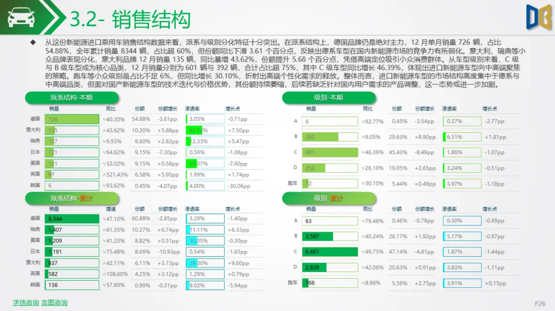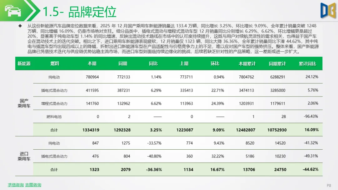 品牌竞争格局呈现 “自主领跑、进口疲软” 的态势。国产乘用车 12 月销量133.43万辆,同比增长3.25%,全年累计1248.28万辆,同比增幅16.09%,自主车企12月占比达87.45%,比亚迪以31.02万辆单月销量稳居龙头,吉利、小米等品牌增速亮眼。新势力与跨界品牌表现突出,小米汽车12月销量4.94万辆,同比暴增93.81%,零跑、银河等同比增长超30%。相比之下,进口新能源车型持续疲软,12 月销量仅1323辆,同比大降36.36%,全年累计1.37万辆,同比下滑44.62%,德系品牌虽为进口主力,但面对国产车型挤压,份额持续萎缩。