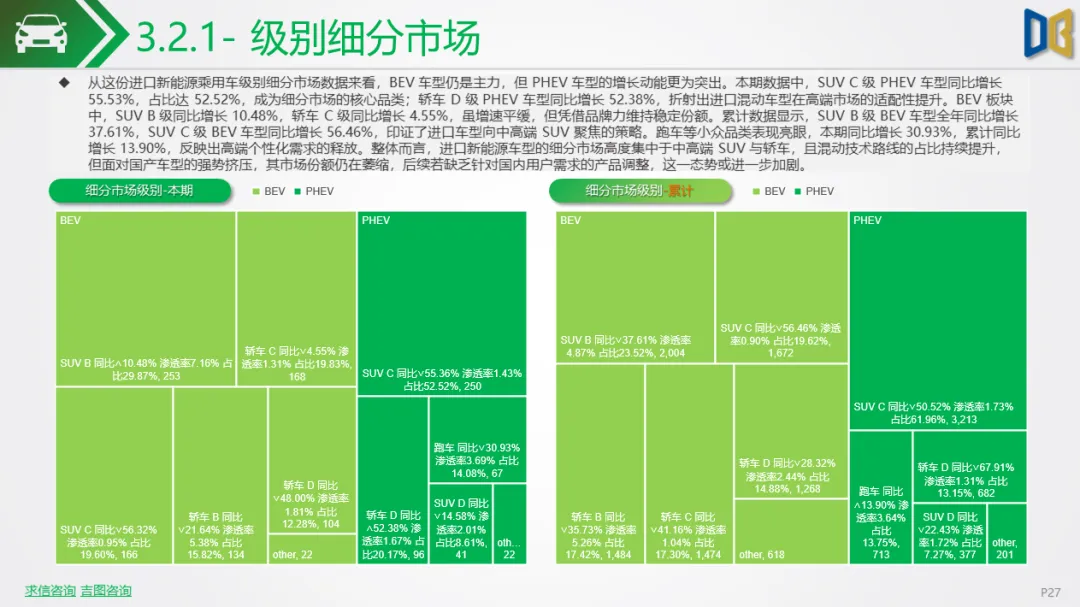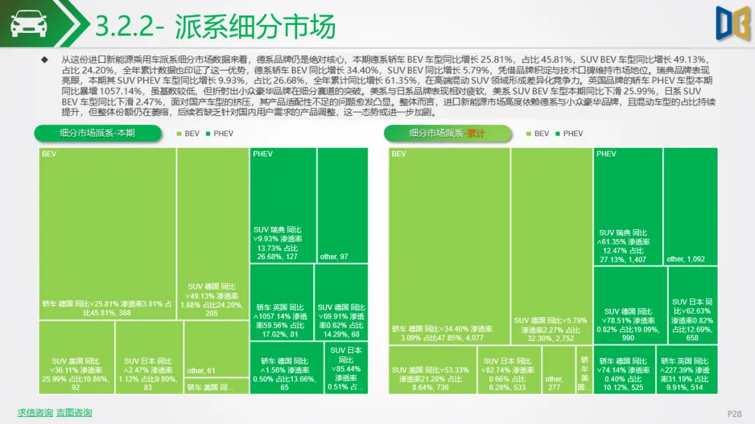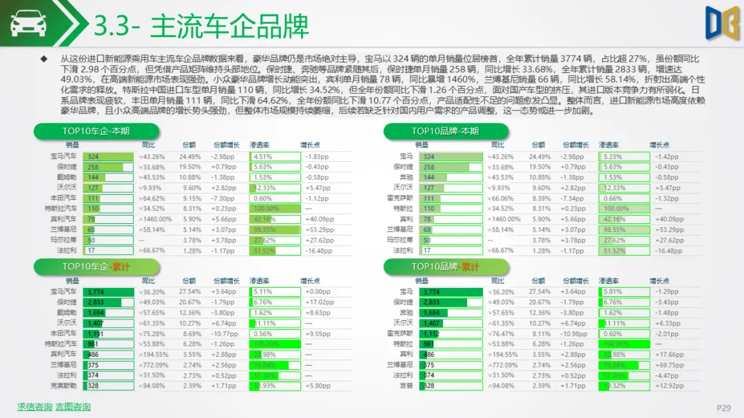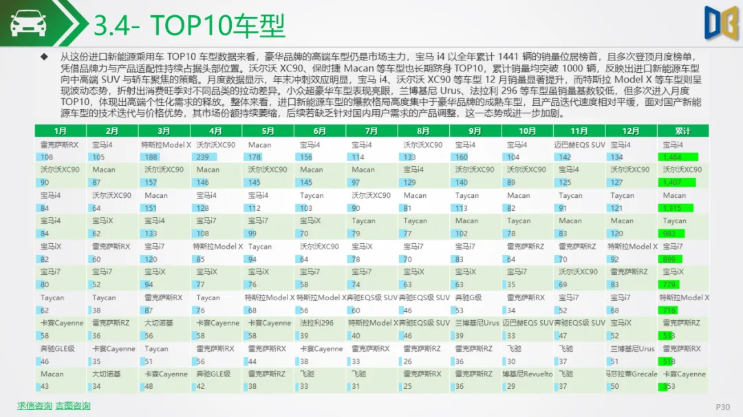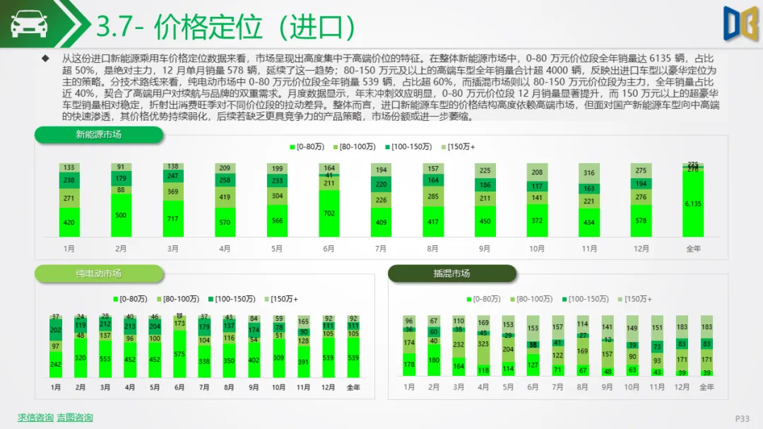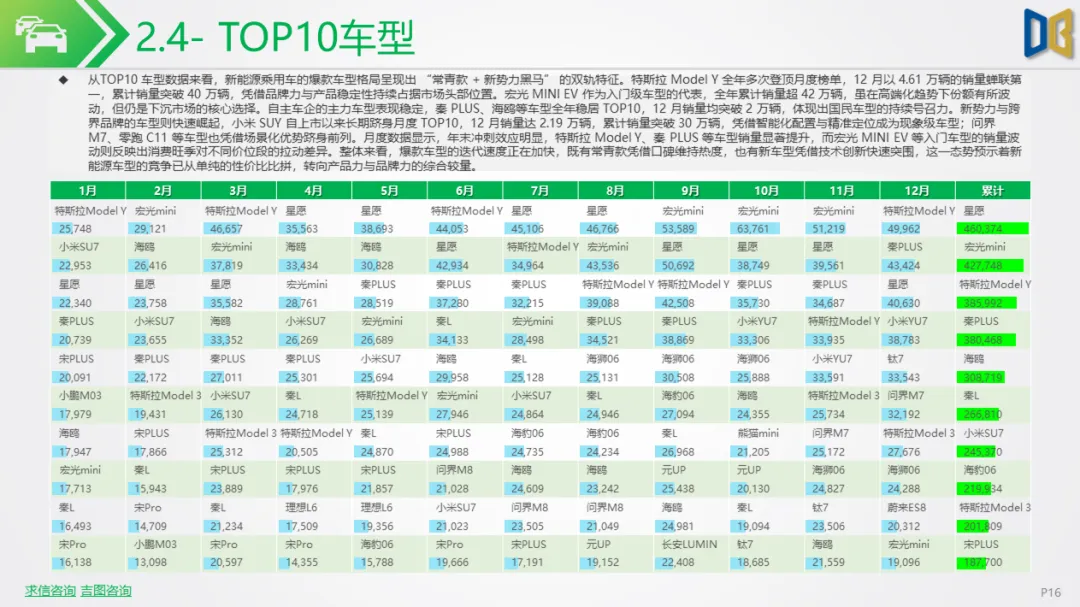 品牌竞争格局呈现 “自主领跑、进口疲软” 的态势。国产乘用车 12 月销量133.43万辆,同比增长3.25%,全年累计1248.28万辆,同比增幅16.09%,自主车企12月占比达87.45%,比亚迪以31.02万辆单月销量稳居龙头,吉利、小米等品牌增速亮眼。新势力与跨界品牌表现突出,小米汽车12月销量4.94万辆,同比暴增93.81%,零跑、银河等同比增长超30%。相比之下,进口新能源车型持续疲软,12 月销量仅1323辆,同比大降36.36%,全年累计1.37万辆,同比下滑44.62%,德系品牌虽为进口主力,但面对国产车型挤压,份额持续萎缩。