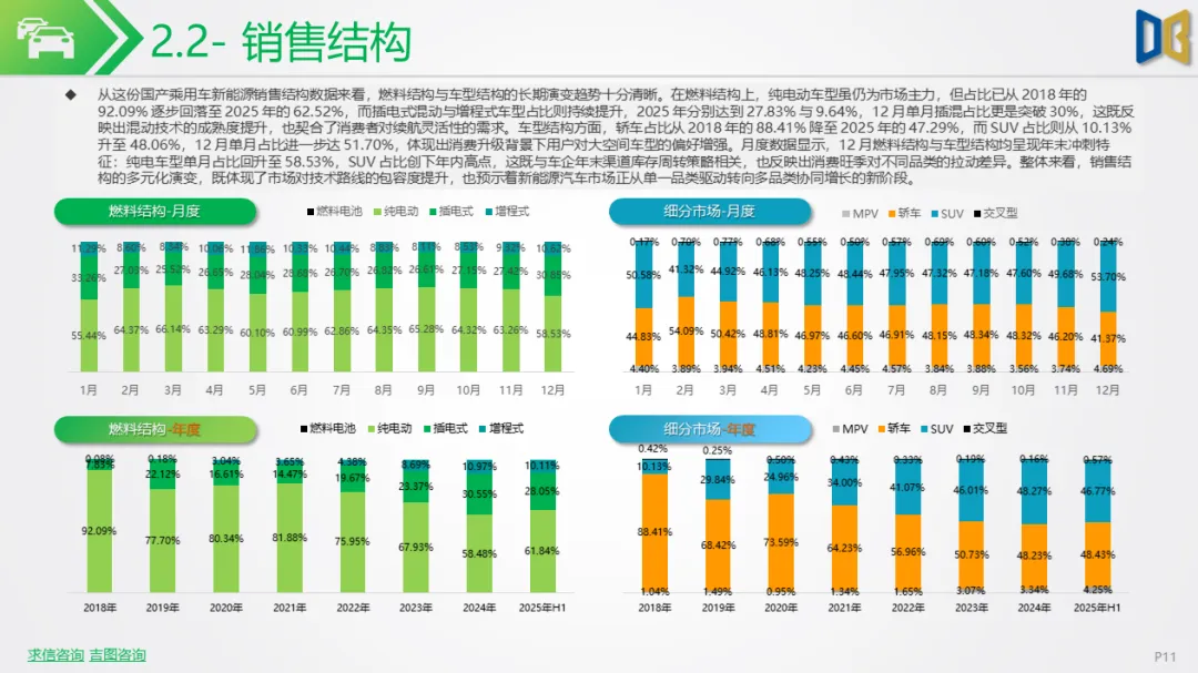 从市场走势来看,2025年呈现 “上半年冲高、下半年放缓” 的明显分化。上半年销量逐季抬升,3 月、6 月同比增幅分别达29.62%、27.50%,受益于各地促消费政策集中落地与车企新车型密集投放;进入下半年后增速逐步放缓,9 月 11.49%的同比增幅成为年内高点,10 月、11 月增速转负,反映消费动能阶段性衰减。这一变化背后,既有前期政策红利边际效应减弱的影响,也与部分地区需求提前释放、传统燃油车降价促销分流有关,年末销量冲高更多依赖渠道库存周转与短期促销。