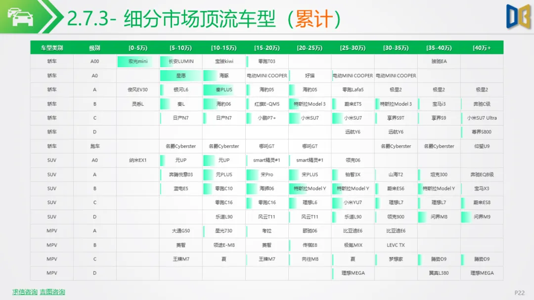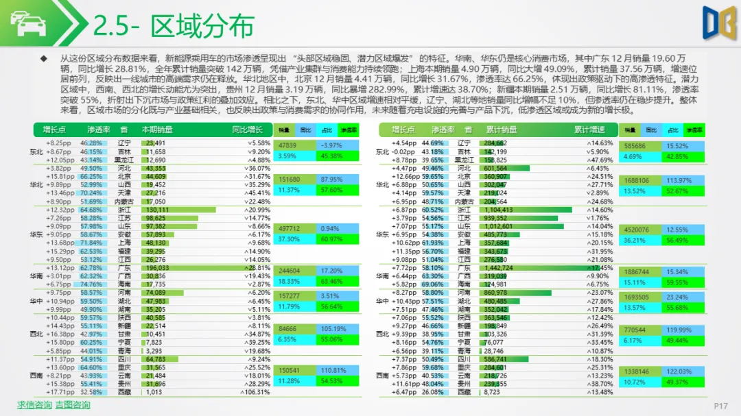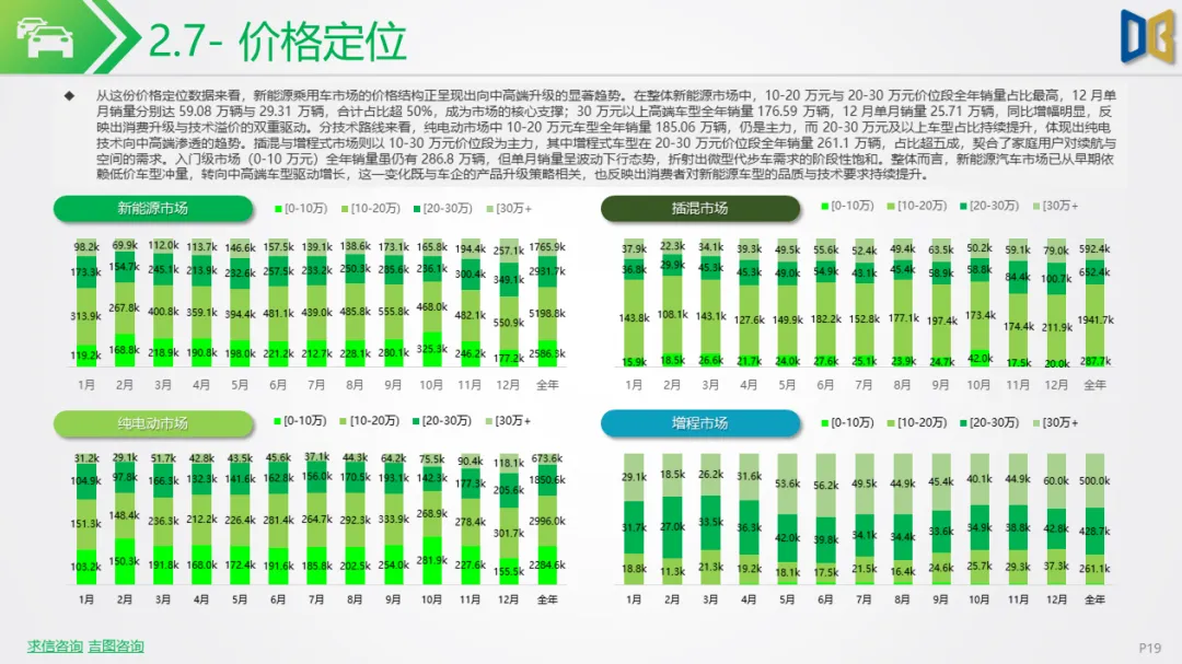 区域与价格分布上,消费集中化与下沉趋势并存。华南、华东为核心消费市场,广东12月销量19.60万辆,同比增长28.81%;西南、西北潜力区域爆发,贵州12月同比暴增282.99%,成为新增长极。价格方面,10-30万元价位段合计占比超50%,成为市场核心支撑,30 万元以上高端车型增速显著,而0-10万元入门市场呈波动下行态势,市场正从 “以价换量” 转向中高端驱动。
