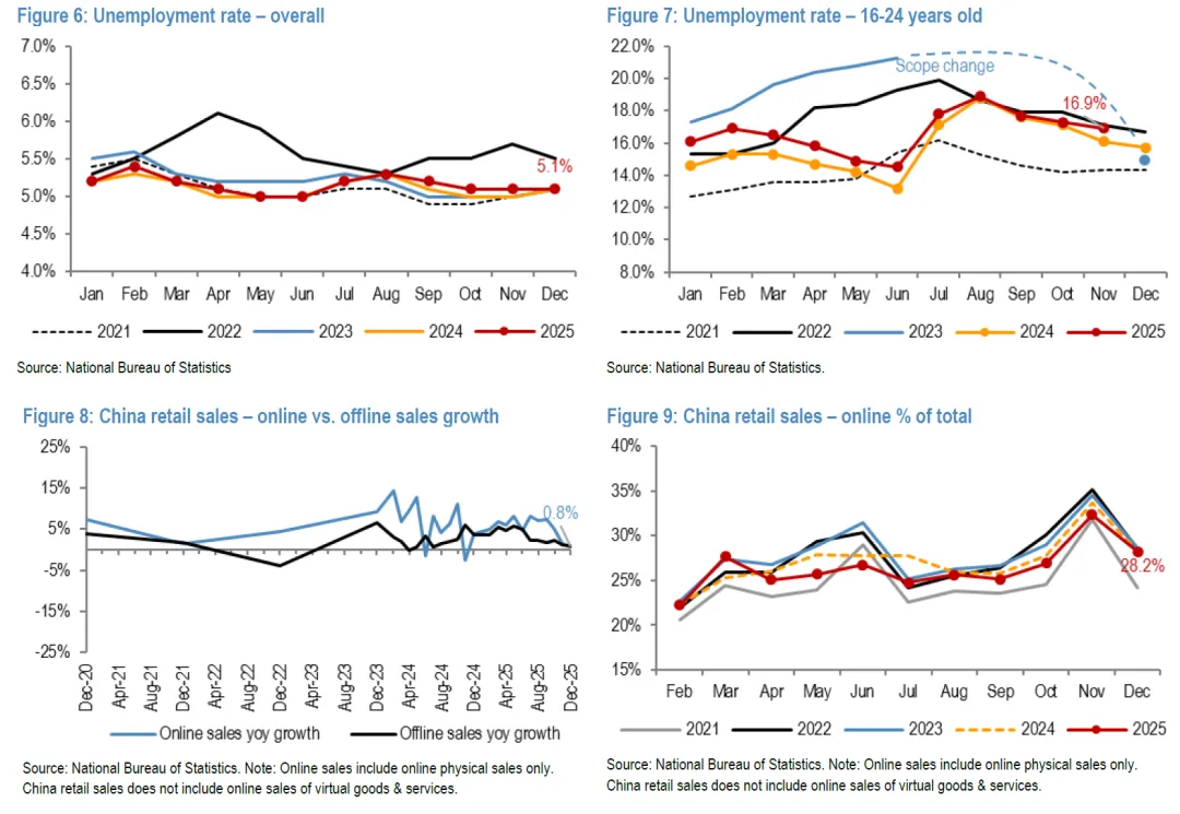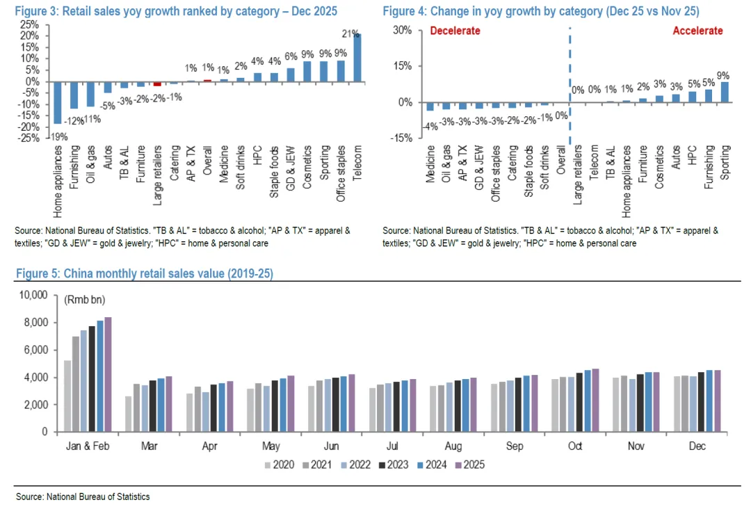 宏观经济表现:中国12月社会消费品零售总额同比增长0.9%(基本符合彭博社预期的1.0%),增速较11月的1.3%、10月的2.9%以及9月的3.0%有所放缓。