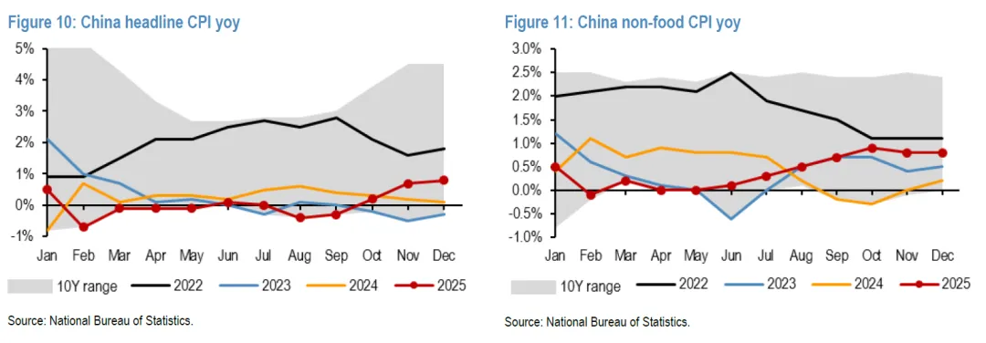 - 消费者物价指数(CPI):12 月 CPI 同比上涨 0.8%(11 月为 +0.7%)。其中,食品类 CPI 同比上涨 1.1%,非食品类 CPI 上涨 0.8%。核心 CPI