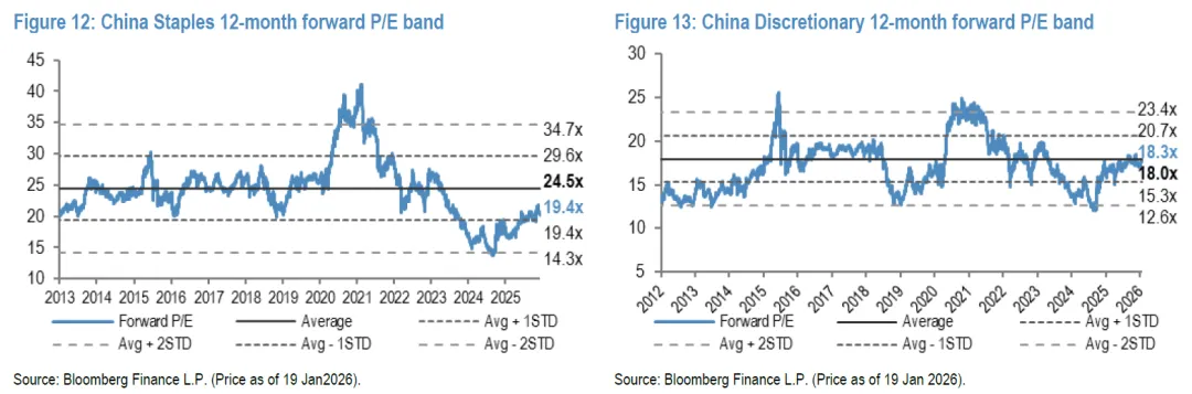 估值方面,这两个板块的远期市盈率(Forward P/E)分别下调了 4% / 上调了 1%,目前分别为 19倍 / 18倍(相比之下,MSCI中国指数/恒生指数估值上调了 4% / 4%,目前分别为 14倍 / 13倍)。