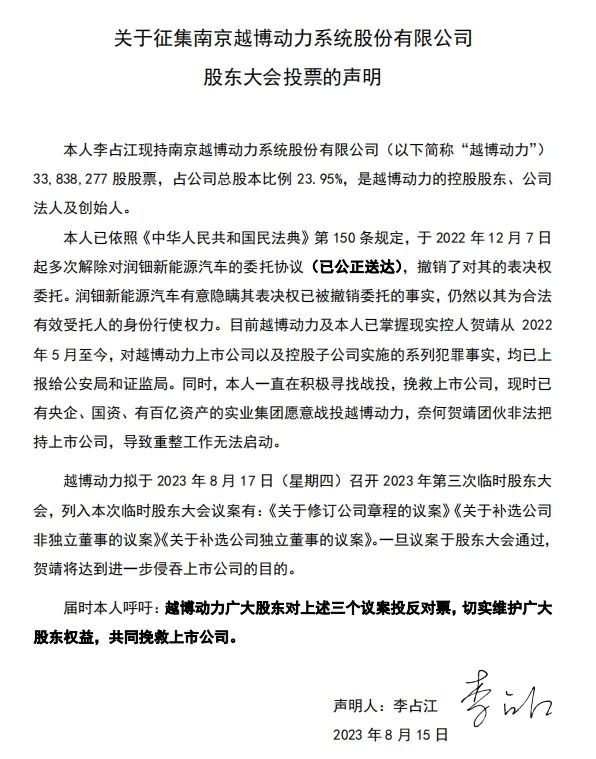 就在前一日,李占江已公开发布声明表示,其早于2022年12月7日起多次解除对润钿新能源汽车的委托协议(已公证送达),撤销了对其的表决权委托,并征集投资者进行维权。