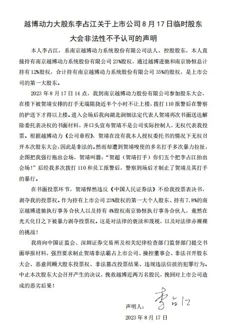 值得注意的是,李占江方面仍在积极寻找战投,设法挽救上市公司。其声明显示,已有央企、国资、百亿资产的实业集团愿意战投越博动力,但贺靖团伙非法把持上市公司,导致重整工作无法启动,其试图制造既成事实掩盖非法身份的行为,更是严重损害了广大投资者和债权人的合法权益。