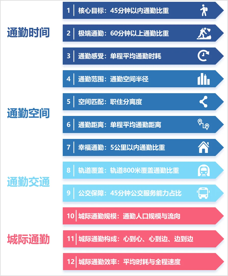 延续通勤时间、通勤空间、通勤交通9项核心指标,追踪45个主要城市职住、通勤特征的变化;