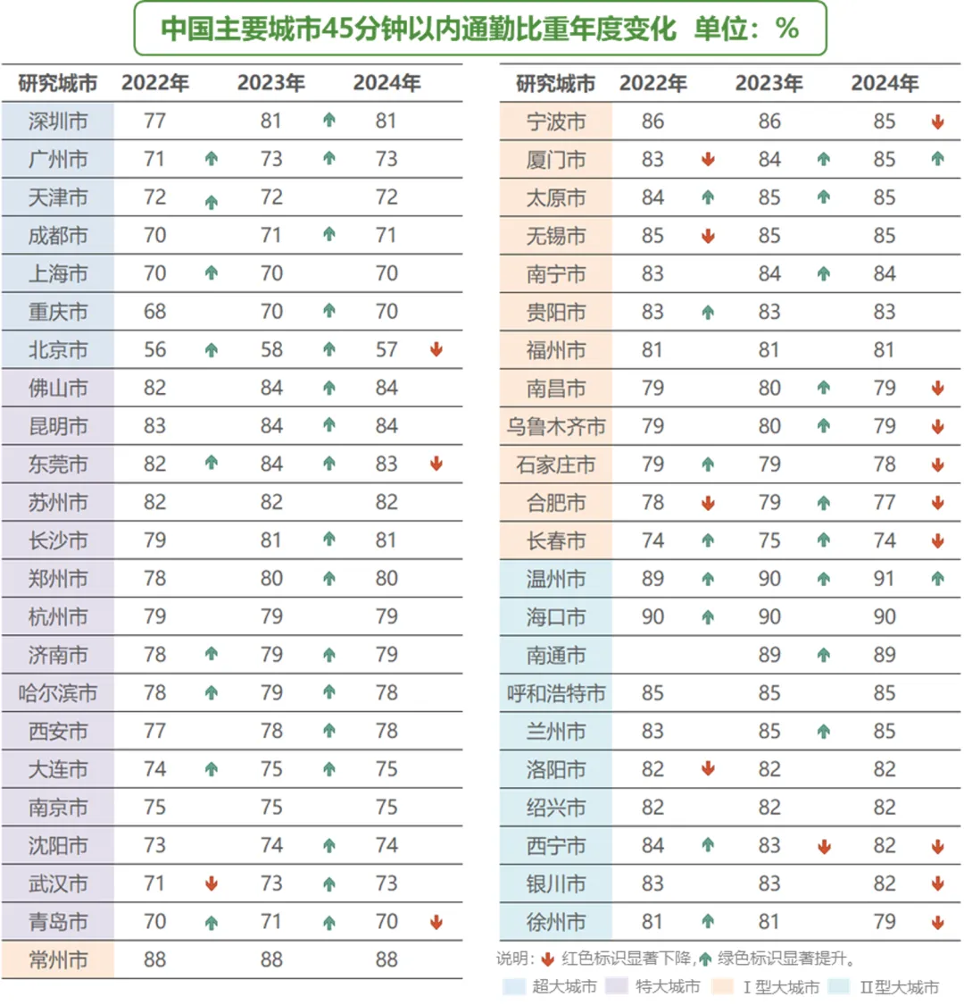 至2024年底,主要城市45分钟以内通勤比重总体平均水平77%,较2020年增加1个百分点。其中,超大城市平均71%、特大城市平均78%、Ⅰ型大城市82%、Ⅱ型大城市85%.