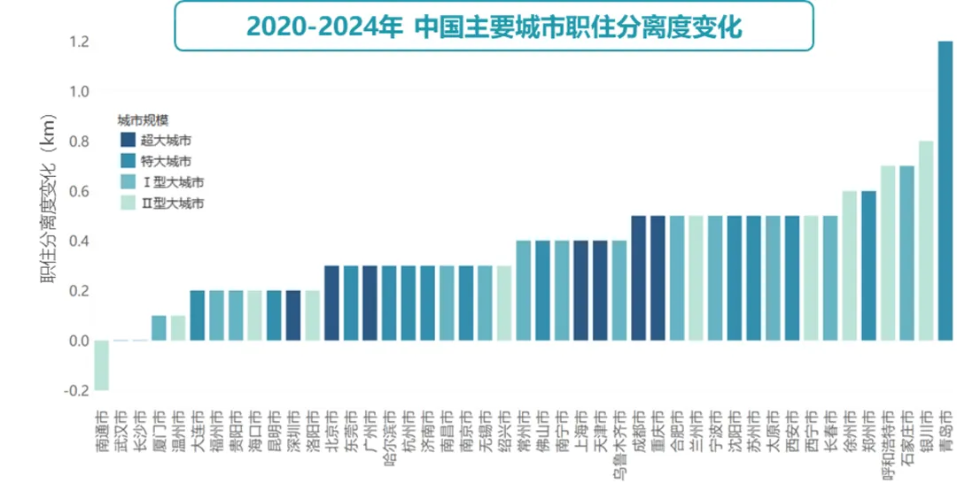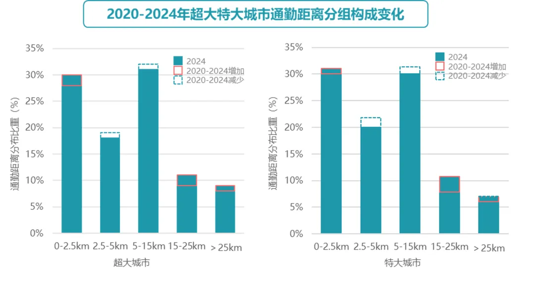 2020-2024年,是中国主要城市从“外延扩张”向“内涵增长”的转型发展阶段。虽然,城市通勤半径不断扩展,职住分离度和平均距离持续增长,但受益于轨道与城市交通基础设施的完善,45分钟以内通勤比重保持稳步提升。