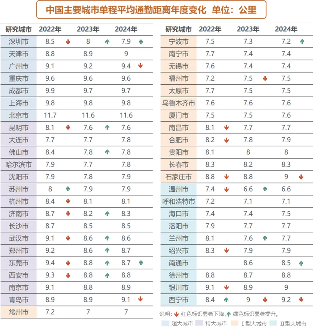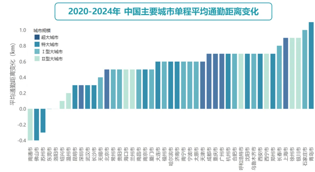2024年,超大城市平均通勤距离9.6公里,特大城市8.3公里。全国通勤距离最长的城市北京,11.6公里,也是唯一超过10公里的城市。