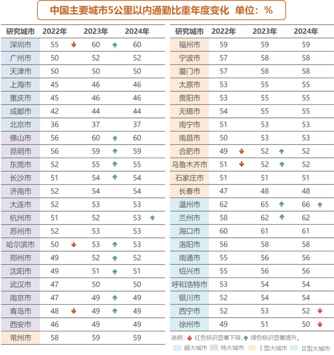 至2024年底,主要城市5公里内幸福通勤比重52%,其中超大城市平均水平48%、特大城市53%、Ⅰ型大城市达54%、 Ⅱ型大城市57%。