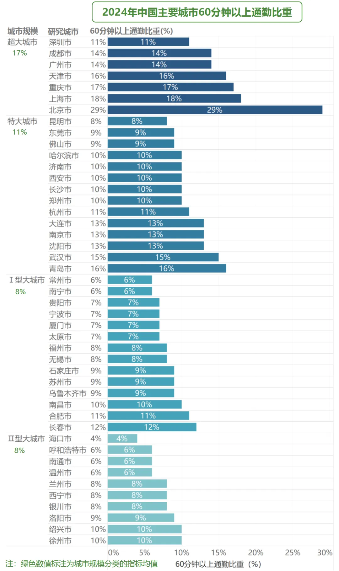 2024年底,主要城市60分钟以上极端通勤比重总体平均12%,同比持平。其中,超大城市17%、特大城市11%,Ⅰ型、Ⅱ型大城市均是8%。45个主要城市中41个城市极端通勤同比“零增长”。