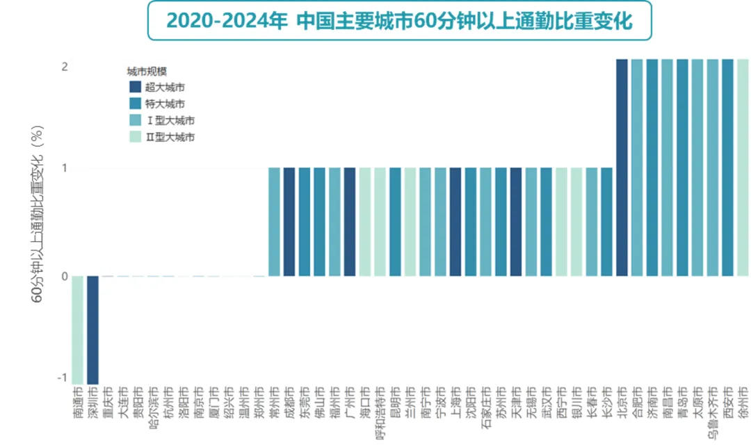 2020-2024年,32个主要城市(占比超70%)的极端通勤比重增加1-2个百分点,8个城市持平,仅有深圳、南通2个城市出现了1个百分点微弱下降,虽然快速加剧的趋势有所放缓,但极端通勤人口比重仍在增加,尚未得到有效的降低。