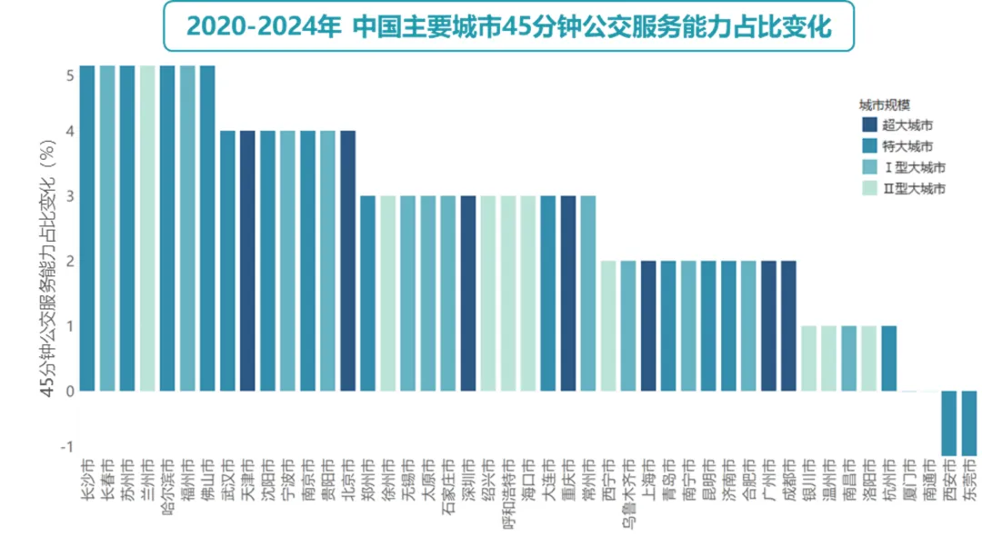 与2020年相比,45个主要城市中41个城市(占比90%)45分钟公交通勤服务能力显著提升,长沙、长春、苏州、兰州、哈尔滨等城市提升5个百分点。
