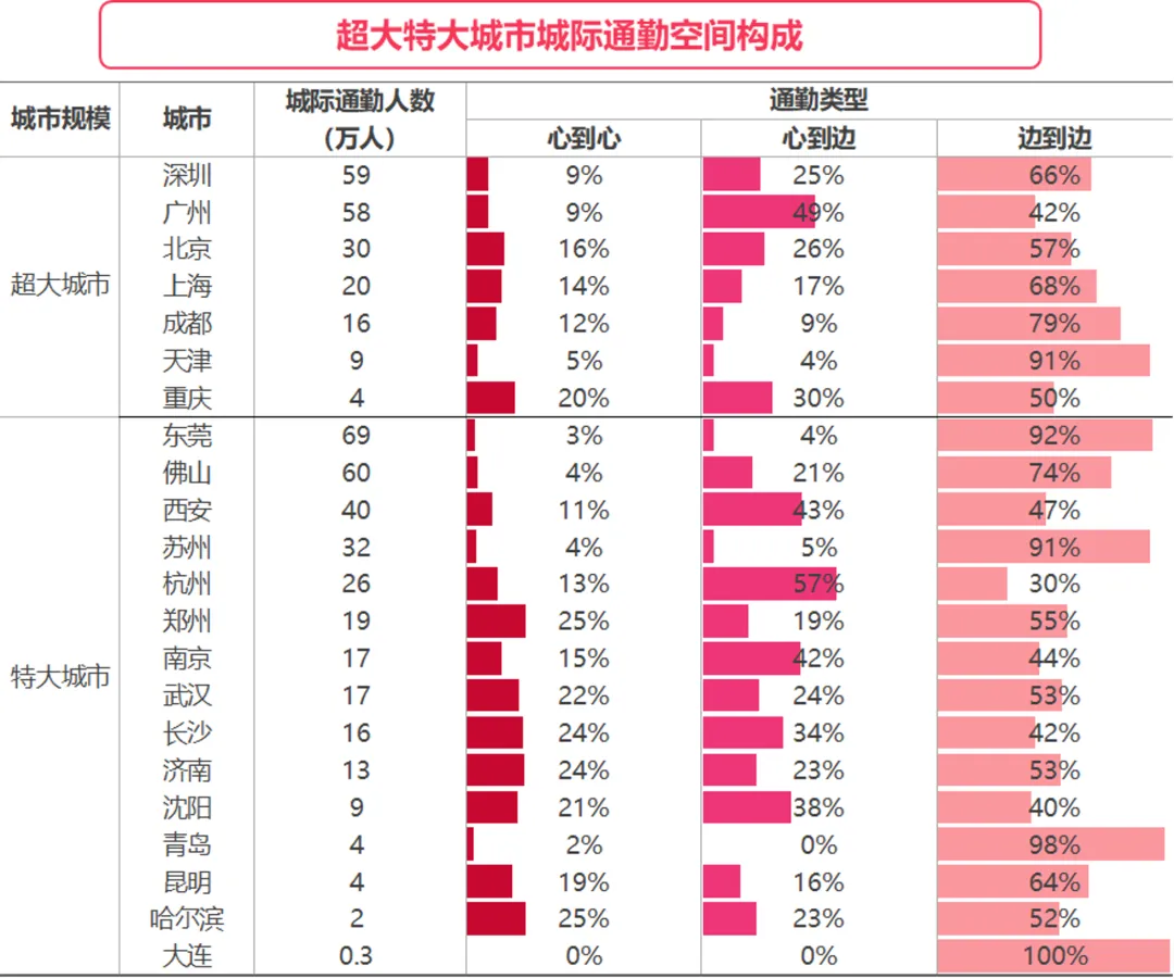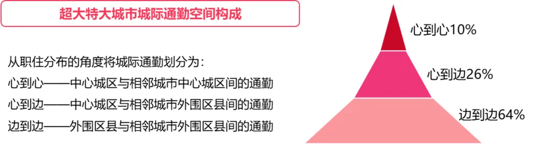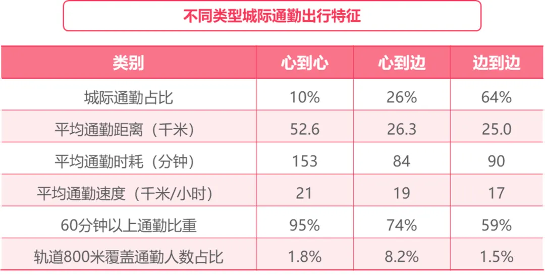 城际通勤人口中 “边到边”、“心到边”、“心到心”三种类型占比分别为64%、26%和10%,平均通勤距离分别为25公里、26公里和53公里。