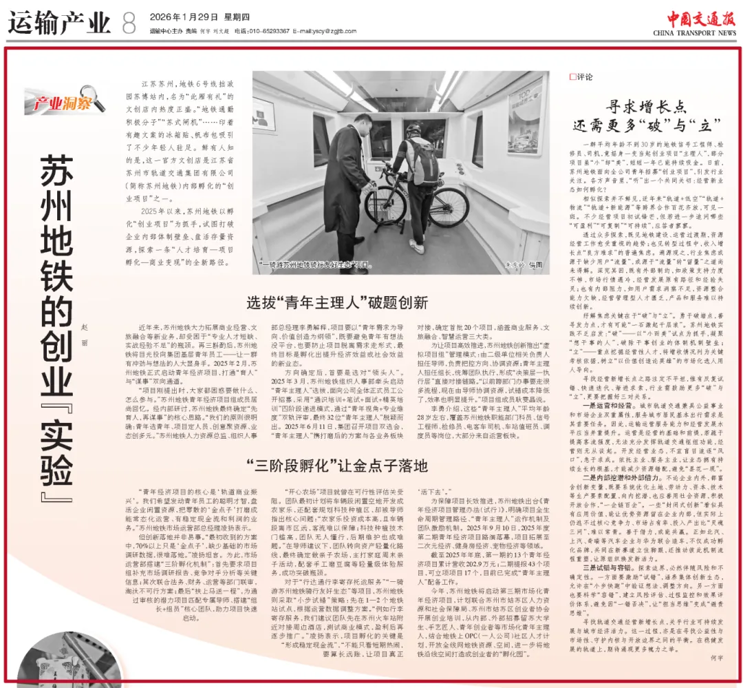 1月29日,《中国交通报》刊发深度报道《苏州地铁的创业“实验”》,并配发专题评论,围绕轨道交通行业可持续发展展开深度探讨。报道以青年经济项目为核心,点赞苏州地铁依托青年活力激发发展新动能,凭借模式创新推动业态提质升级,以创新之举破局发展难题,展现了苏州地铁在深化国企转型升级、拓宽轨道交通行业商业经营边界等领域,先行先试的担当与亮眼成效。